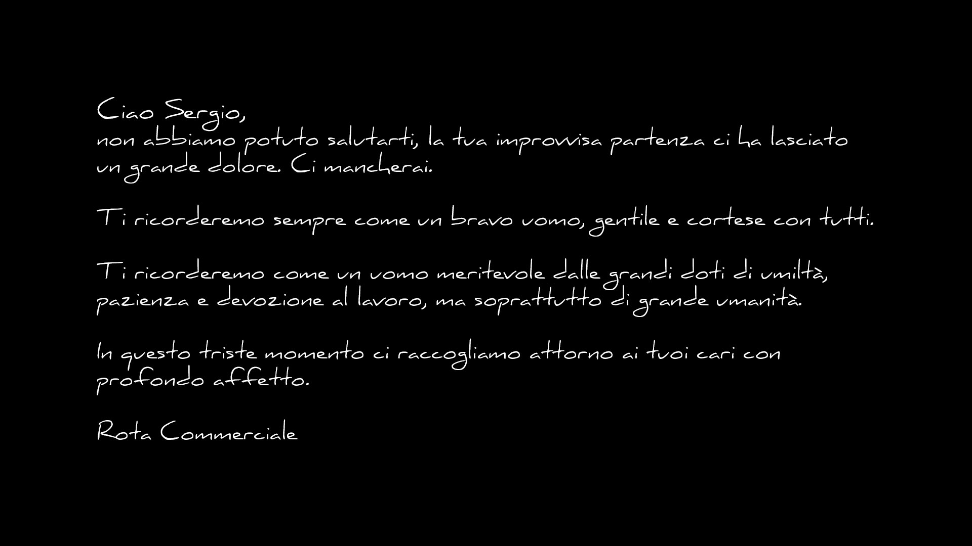 "Ciao Sergio, Sergio non abbiamo potuto salutarti, la tua improvvisa partenza ci ha lasciato un grande dolore. Ci mancherai.