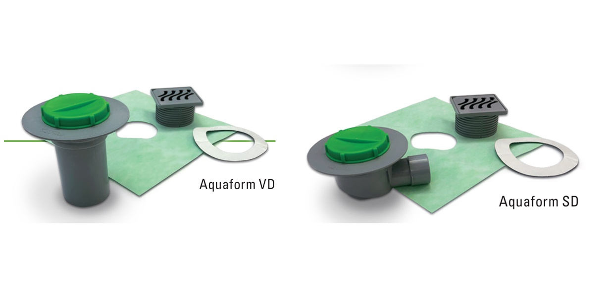 I kit Aquaform VD – SD di Kerakoll  sono utilizzati soprattutto nella realizzazione di sistemi di scarico a raccordo verticale o laterale per il deflusso delle acque meteoriche nei sistemi Laminati e con gli impermeabilizzanti Aquastop in docce, bagni, cucine, balconi, terrazzi, lastrici solari e superfici orizzontali di qualsiasi dimensione.