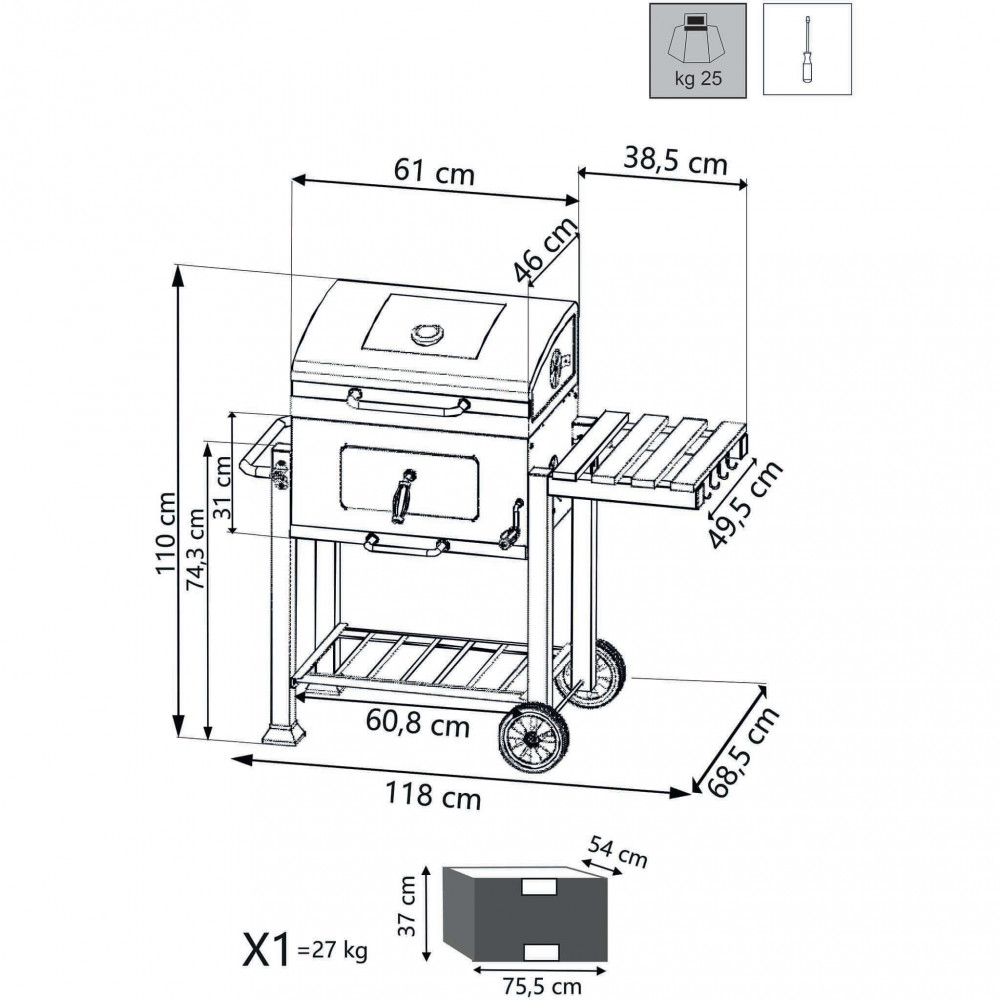 Struttura in acciaio verniciato NERO fornito di 2 griglie e apri bottiglia ripiano laterale in acciaio pieghevole coperchio con regolazione della temperatura Dimensioni: cm 118 x 56 x 110 h