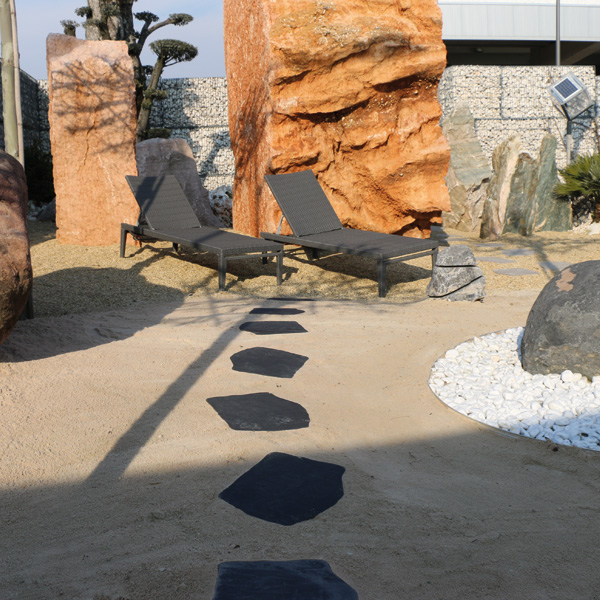 Camminamenti giardino in gres, che fanno parte di una nuova linea di pavimentazioni per esterno (pavimentazione esterna). Questi passi giapponesi (camminamenti per giardini), come pavimentazione esterna possiedono formidabili caratteristiche estetiche. Ripropongono fedelmente, infatti, le antiche pavimentazioni in pietra naturale, riproducendo i tradizionali materiali segnati dal tempo.