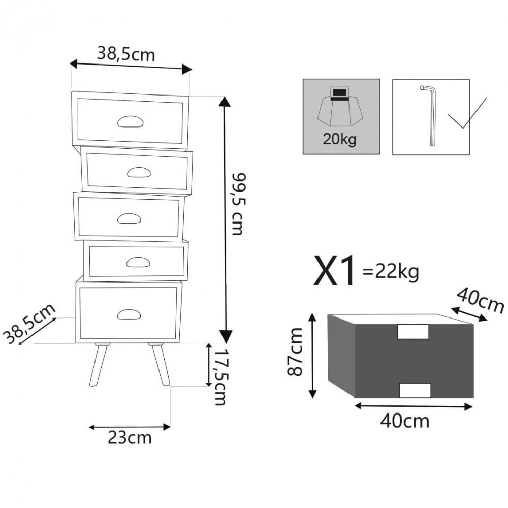 Struttura in MDF, gambe in legno di pino, top colore MARRONE 5 cassetti colorati Dimensioni: cm 40 x 36,5 x 99 h