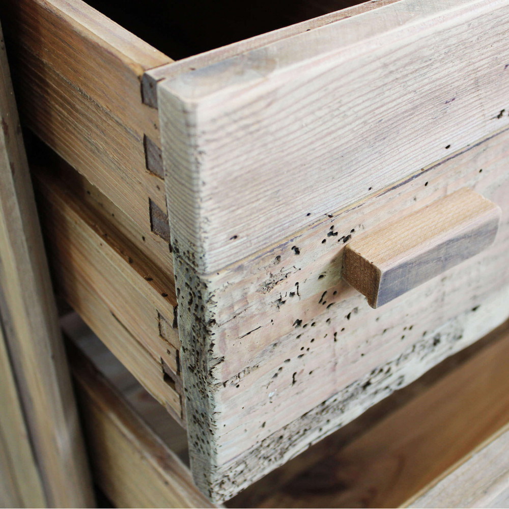 Cassettiera con 4 cassetti e 1 ripiano in legno di pino riciclato Dimensioni: cm 110 x 48 x 92 h