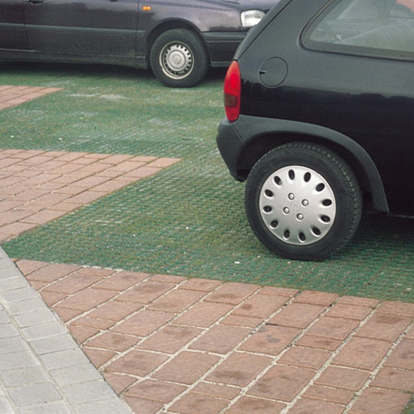 Grigliato erboso ecocompatibile in HDPE, a moduli di dimensioni cm 50 x 50 x 4 (misure esterne).