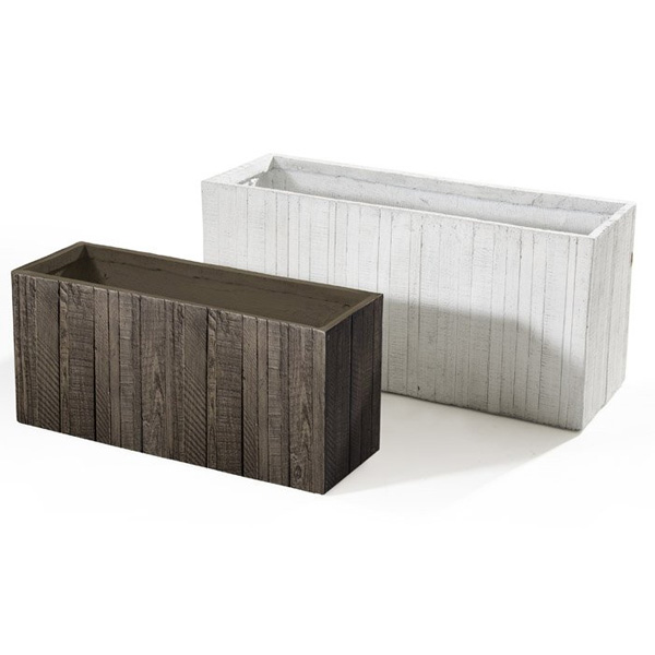 Fioriere a vasca in argilla mista a fibra di vetro con venature effetto legno. Robusti e resistenti alle intemperie sono perfette per abbellire e decorare giardini, verande o terrazze. Disponibili in 2 varianti colore: ghiaccio e marrone. Due dimensioni: 95x32x44 cm e 74.5x25x35 cm.