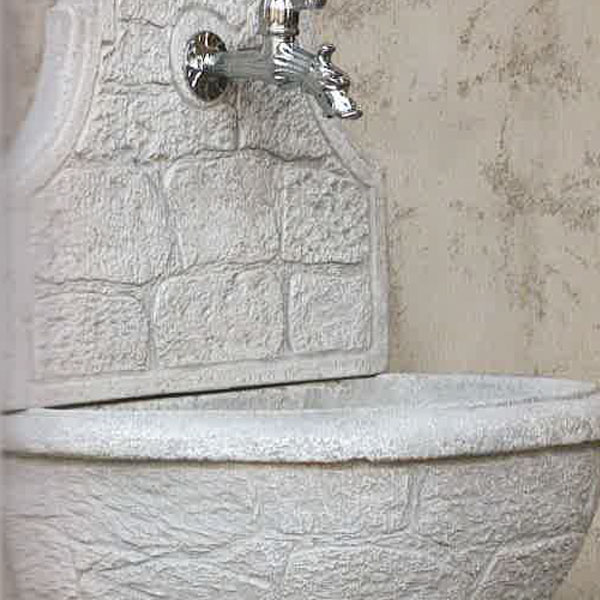 Fontana da muro effetto pietra ricostruita in cemento e granulato di marmo. Realizzata nella finitura anticata, colore grigio.