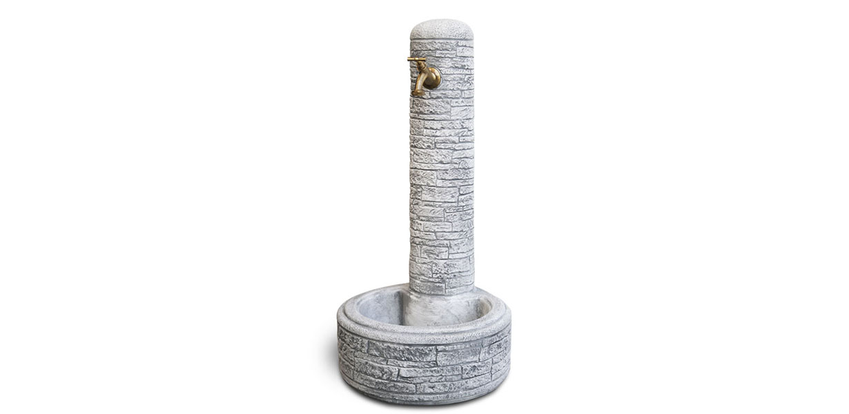 Inoltre, questa fontana in cemento, riprende come elemento decorativo lo spacco della pietra naturale. Questa finitura le dona una maggior estetica, soprattutto nella colore e finitura del grigio anticato.