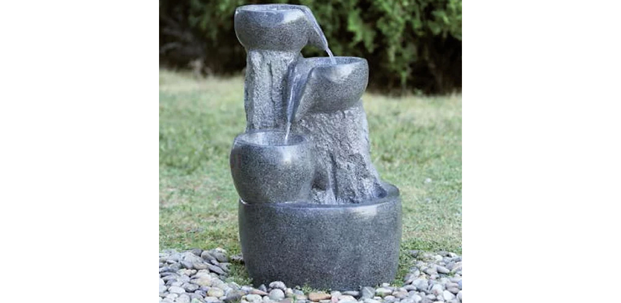 Questa fontana zen da esterno e interno, possiede una forma a tre gradini- ciotole alternate, nelle quali scorre l’acqua, misura 44x40x70 cm ed ha una capacità di 20 litri.