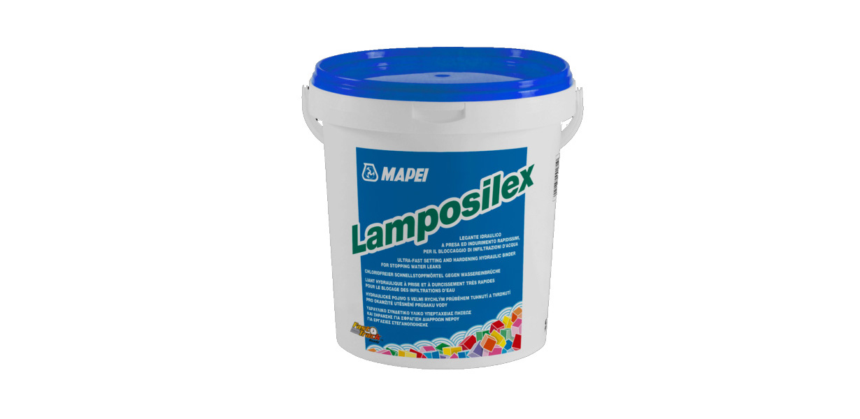 Lamposilex Mapei è un legante idraulico a presa ed indurimento rapidissimi per il bloccaggio di infiltrazioni d’acqua.
