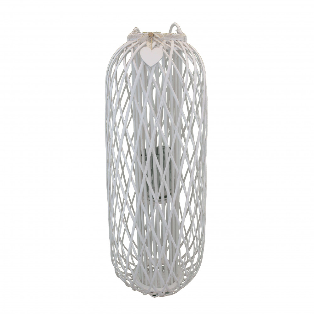 Lanterna BIANCA in vimini e vetro con nastro in pizzo e decoro a cuore Dimensioni: cm Top Ø 22 x 115 h-Centrale Ø 44 x 115 h-Vetro Ø 15 x 21 h