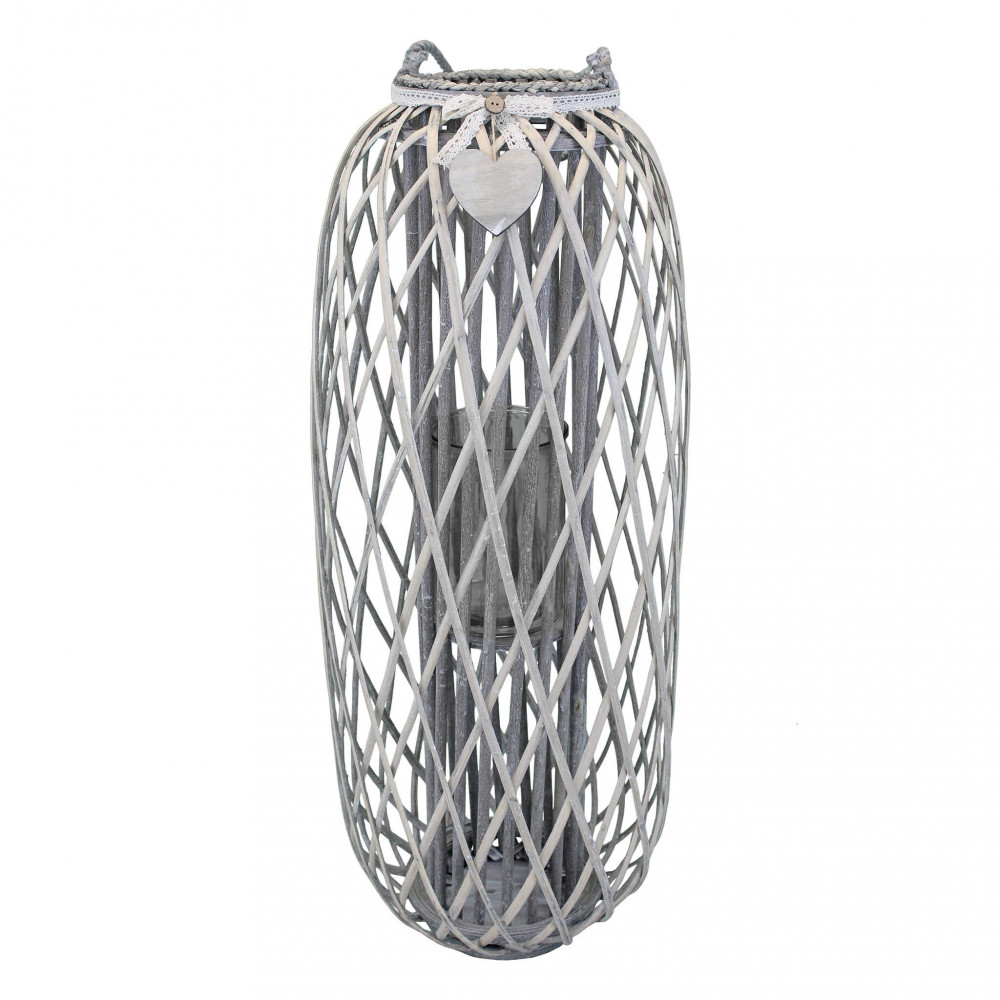 Lanterna GRIGIA in vimini e vetro con nastro in pizzo e decoro a cuore Dimensioni: cm Top Ø 21 x 106 h-Centrale Ø 40 x 106 h-Vetro Ø 15 x 21 h