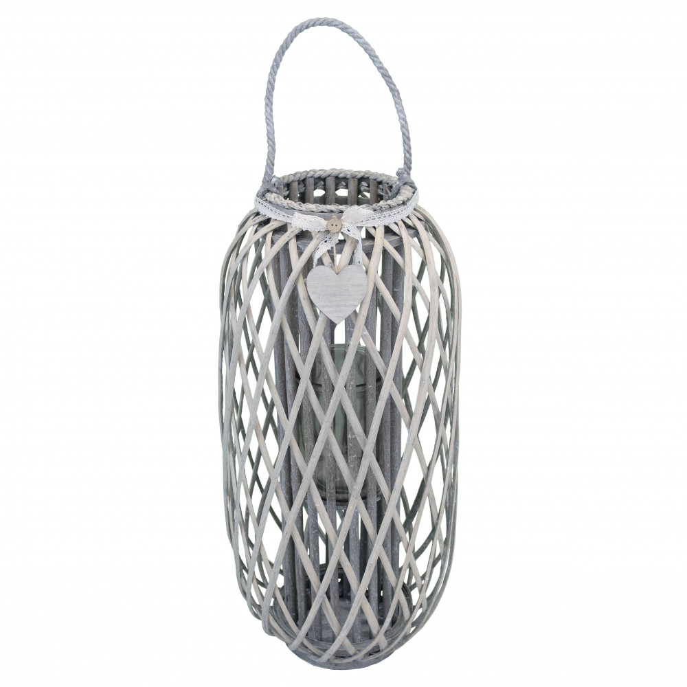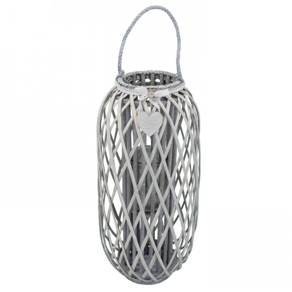 Lanterna GRIGIA in vimini e vetro con nastro in pizzo e decoro a cuore Dimensioni: cm Top Ø 20 x 86 h-Centrale Ø 38 x 86 h-Vetro Ø 15 x 21 h