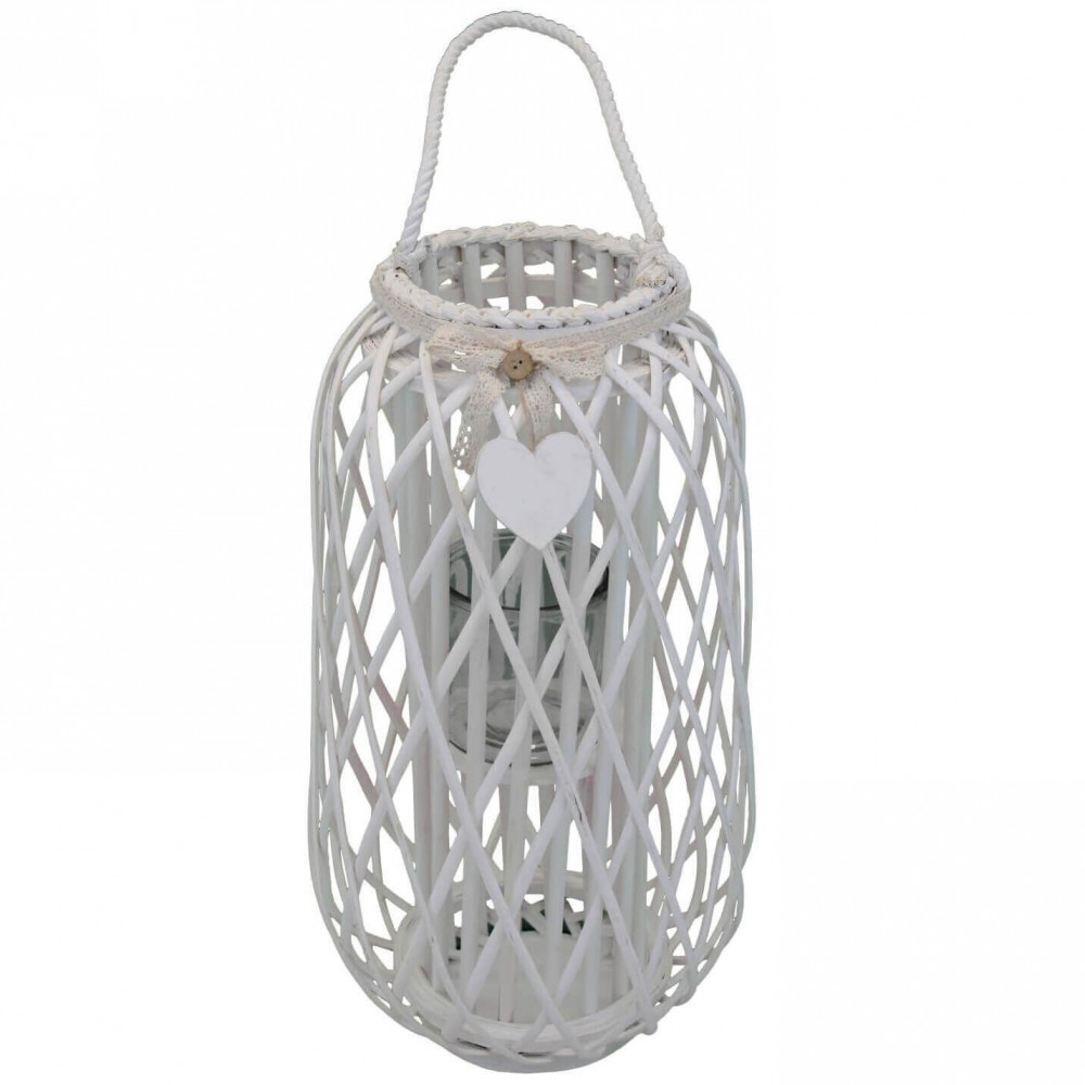 Lanterna BIANCA in vimini e vetro con nastro in pizzo e decoro a cuore Dimensioni: cm Top Ø 18 x 66 h-Centrale Ø 31 x 66 h-Vetro Ø 13 x 17 h