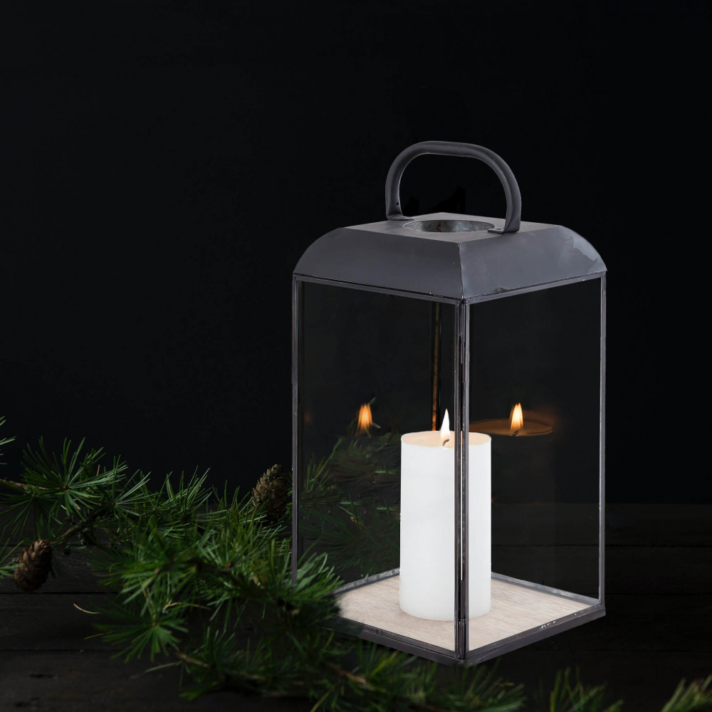 Lanterna ANTRACITE in metallo e vetro con base in legno Dimensioni: cm 19,5 x 19,5 x 44 h