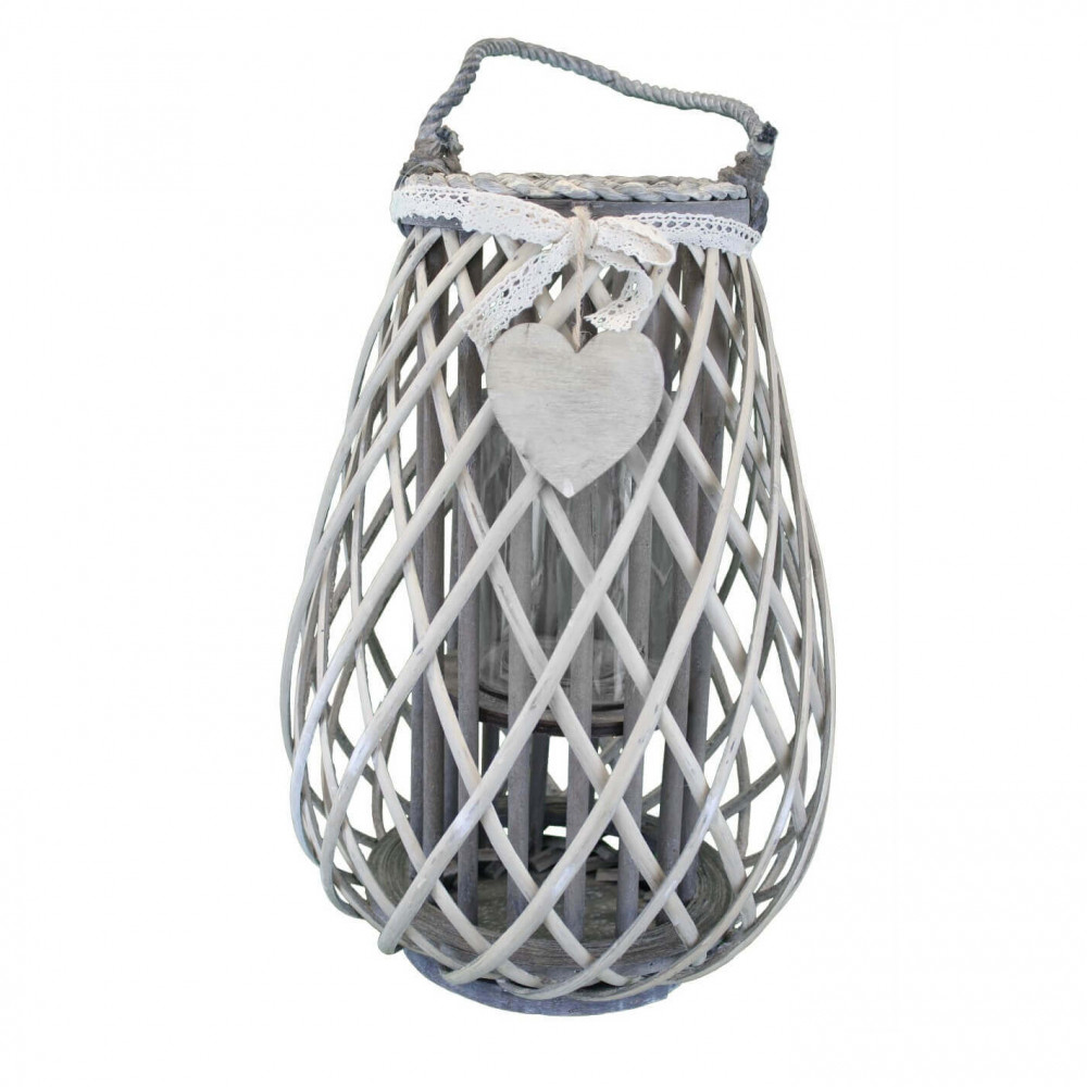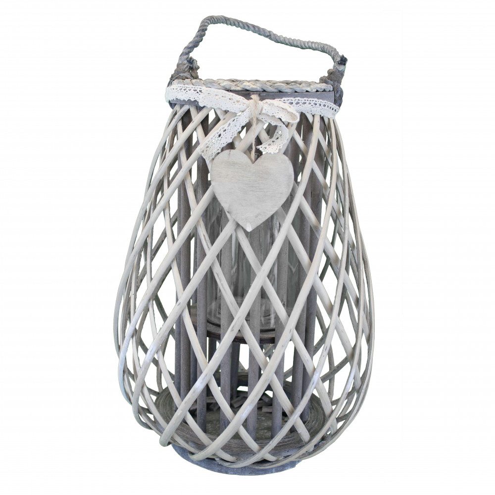 Lanterna GRIGIA in vimini e vetro con nastro in pizzo e decoro a cuore Dimensioni: cm Top Ø 15 x 36 h-Centrale Ø 28 x 36 h-Vetro Ø 12 x 12 h