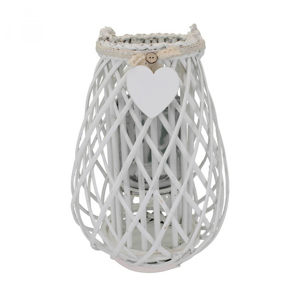 Lanterna BIANCA in vimini e vetro con nastro in pizzo e decoro a cuore Dimensioni: cm Top Ø 17 x 41 h-Centrale Ø 30 x 41 h-Vetro Ø 12,5 x 15 h