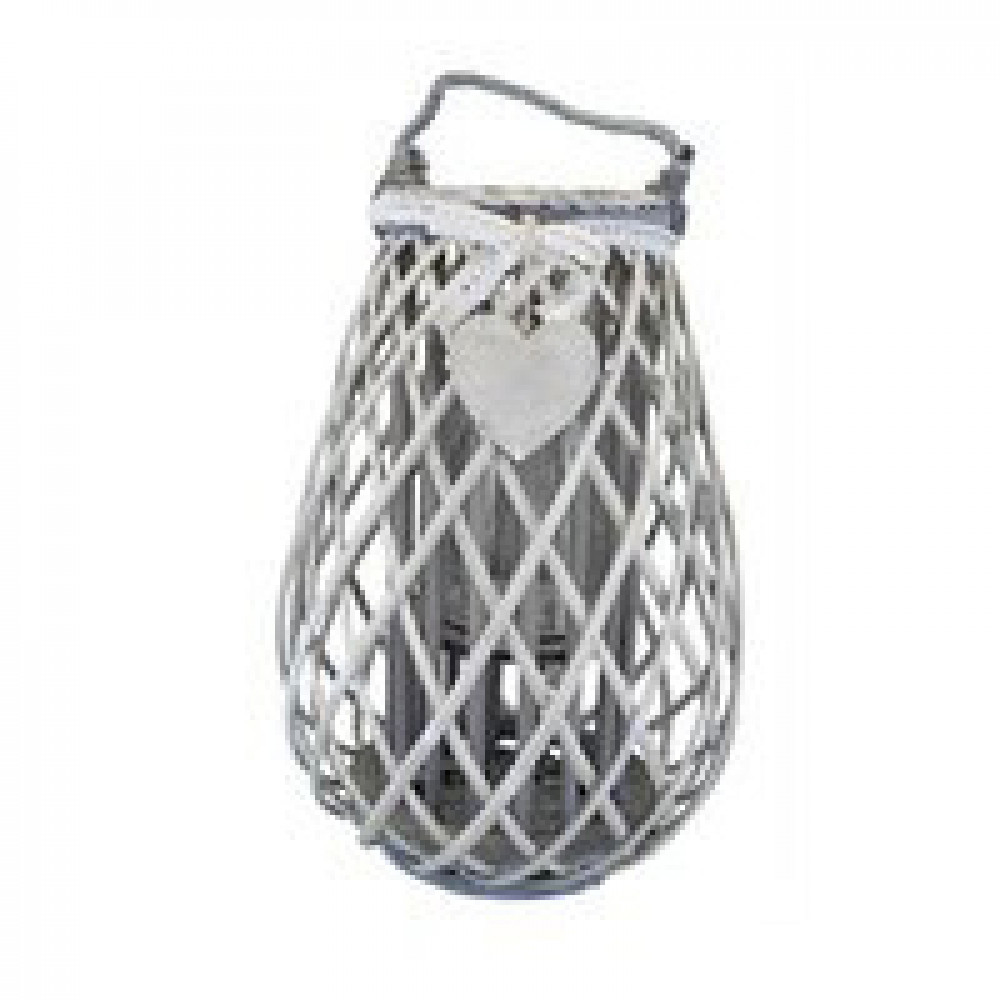 Lanterna GRIGIA in vimini e vetro con nastro in pizzo e decoro a cuore Dimensioni: cm Top Ø 15 x 25 h-Centrale Ø 23 x 25 h-Vetro Ø 10 x 15 h