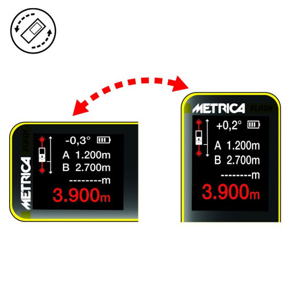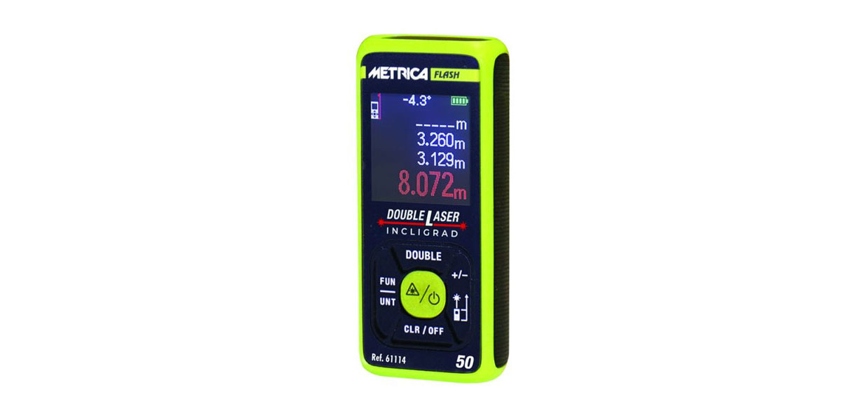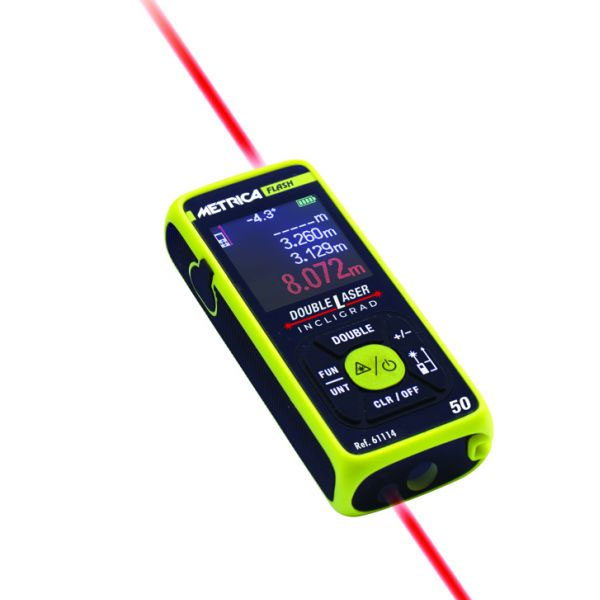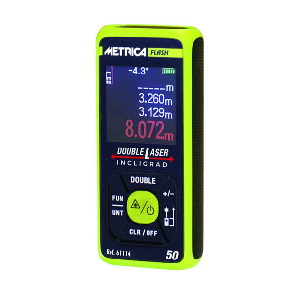 Double Laser Incligrad di Metrica è un nuovissimo strumento di misurazione con doppia funzione laser per misurazione: anteriore e posteriore. Questo laser di Metrica, in aggiunta possiede la funzione Incligrad, ovvero lo strumento da le indicazioni dei gradi sul display.