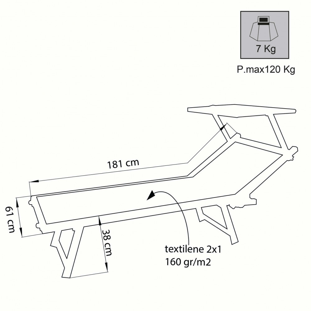 Disponibile BLU, BIANCO, BEIGE MELANGE o GRIGIO MELANGE struttura in alluminio 43×42 mm regolabile in 3 posizioni pm.120 kg, tessuto in textilene 2 x 1 650 gr spessore alluminio 1,2 cm Dimensioni: cm 181 x 61 x 38 h
