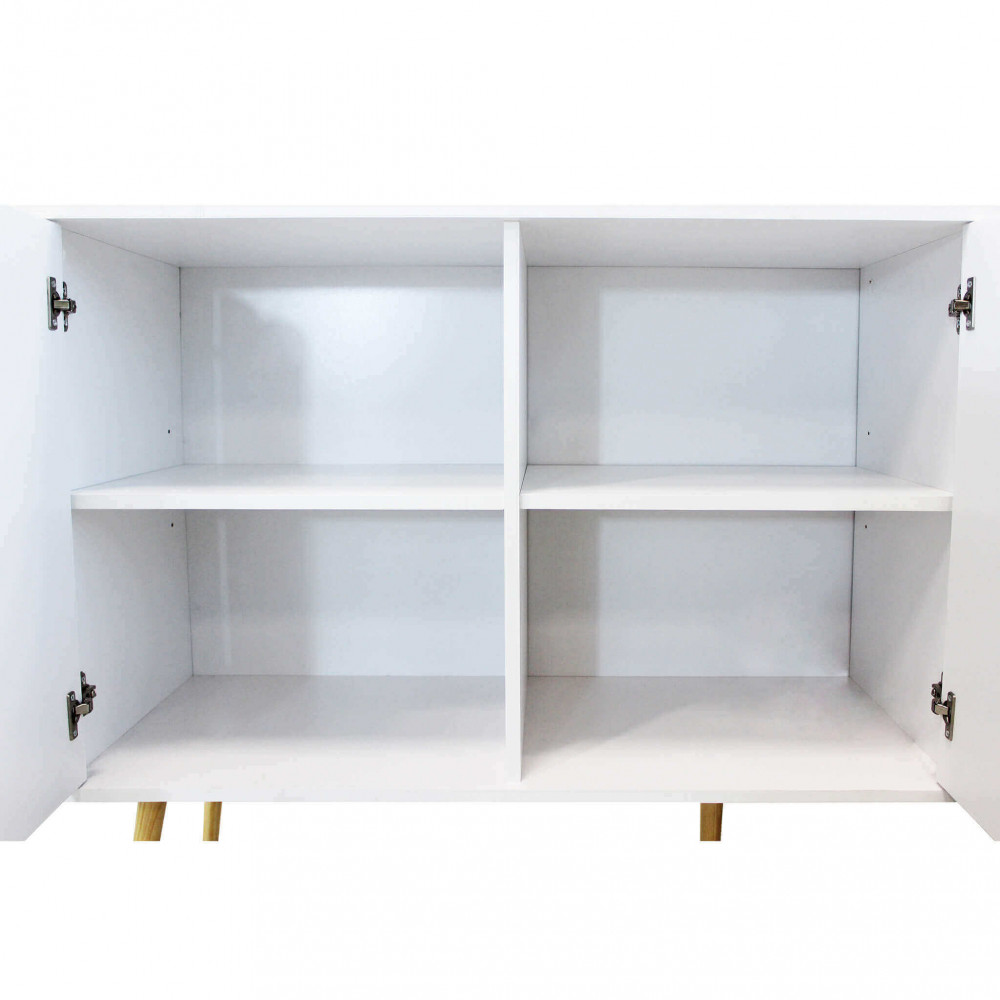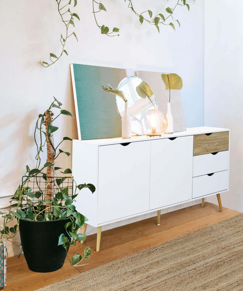 Mobile con 2 ante e 3 cassetti in legno bianco e naturale Dimensioni: cm 147 x 39 x 82 h