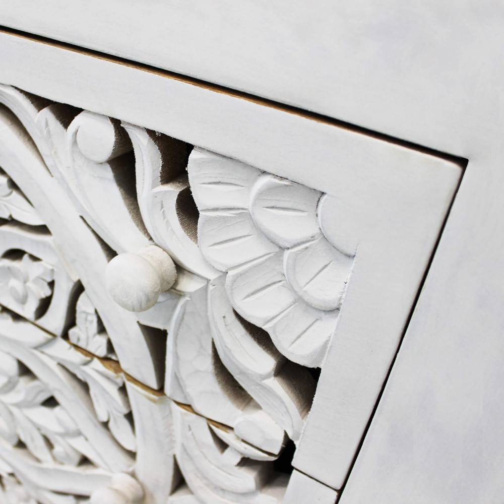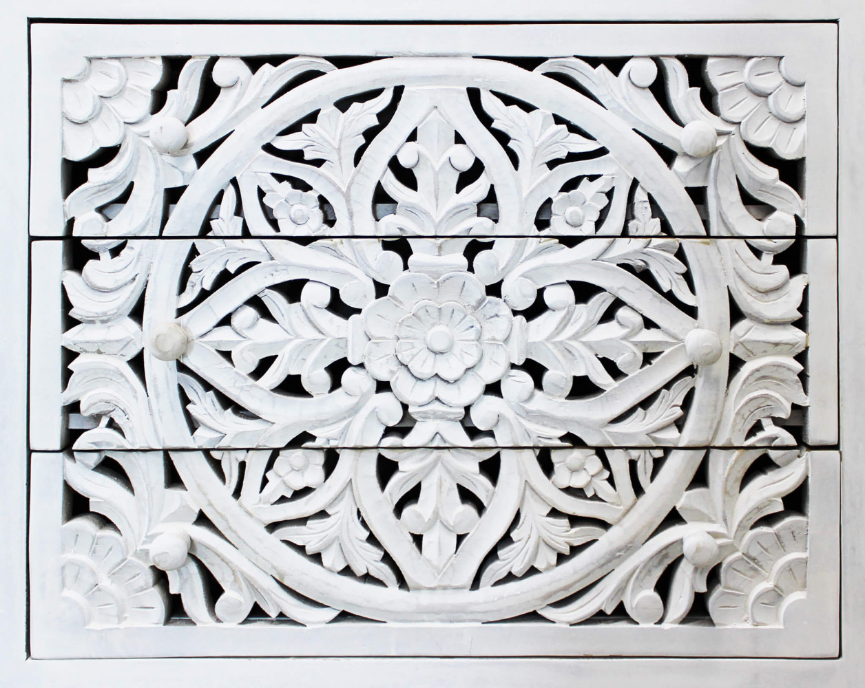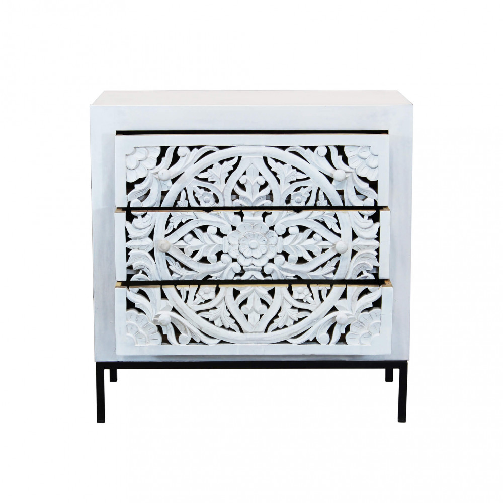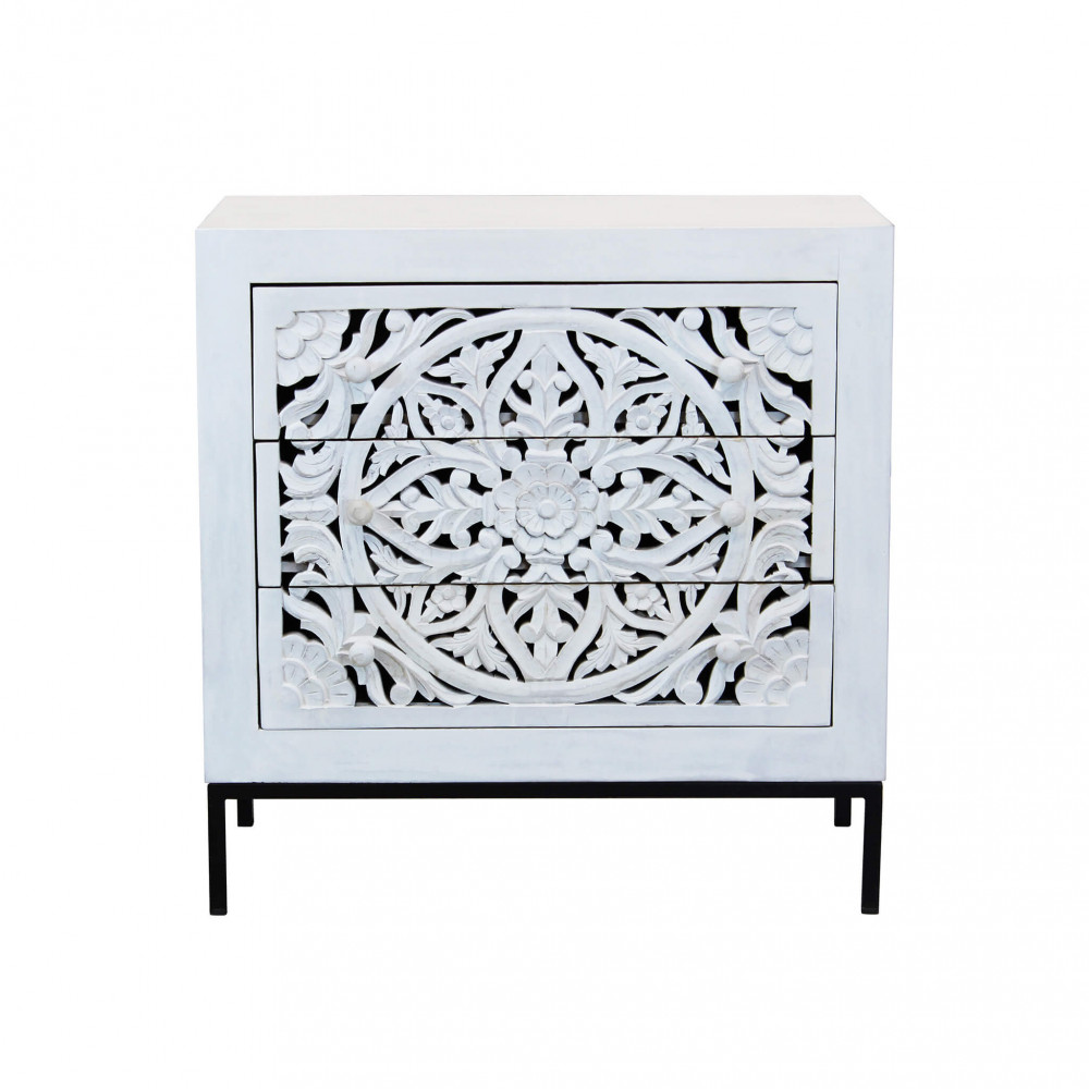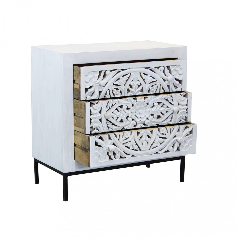 Mobile con decoro sbiancato con 3 cassetti in legno di mango con struttura in ferro Dimensioni: cm 80 x 40 x 80 h