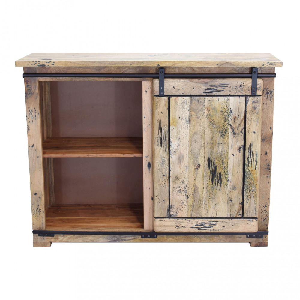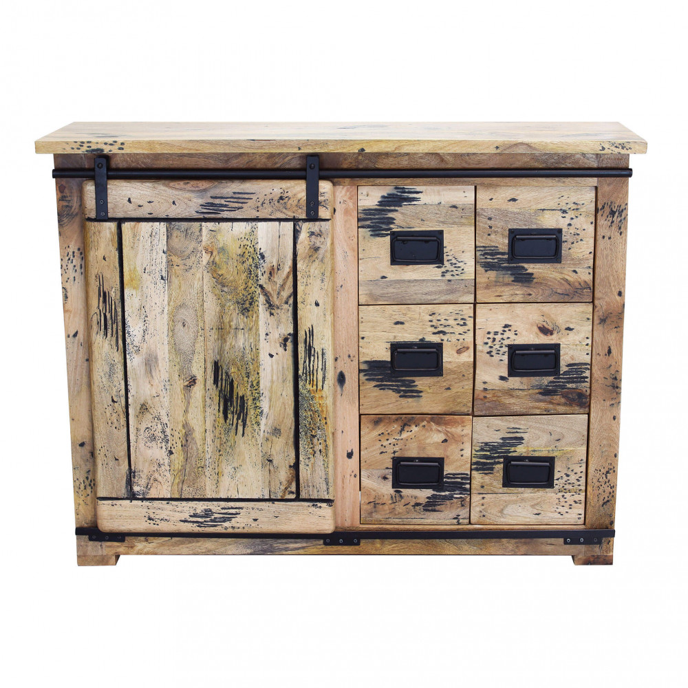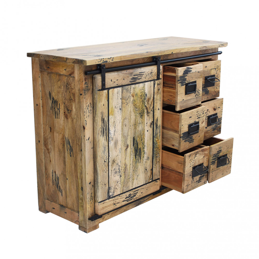 Mobile in legno di mango con 1 anta scorrevole, 2 ripiani e 6 cassetti Dimensioni: cm 120 x 45 x 90 h