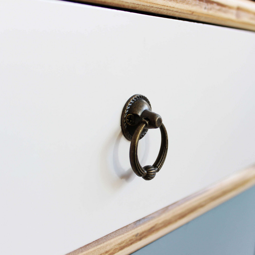 Struttura in MDF, gambe in legno di pino, top colore NATURALE 2 ripiani, 2 ante e 2 cassetti colorati Dimensioni: cm 80 x 35 x 140 h