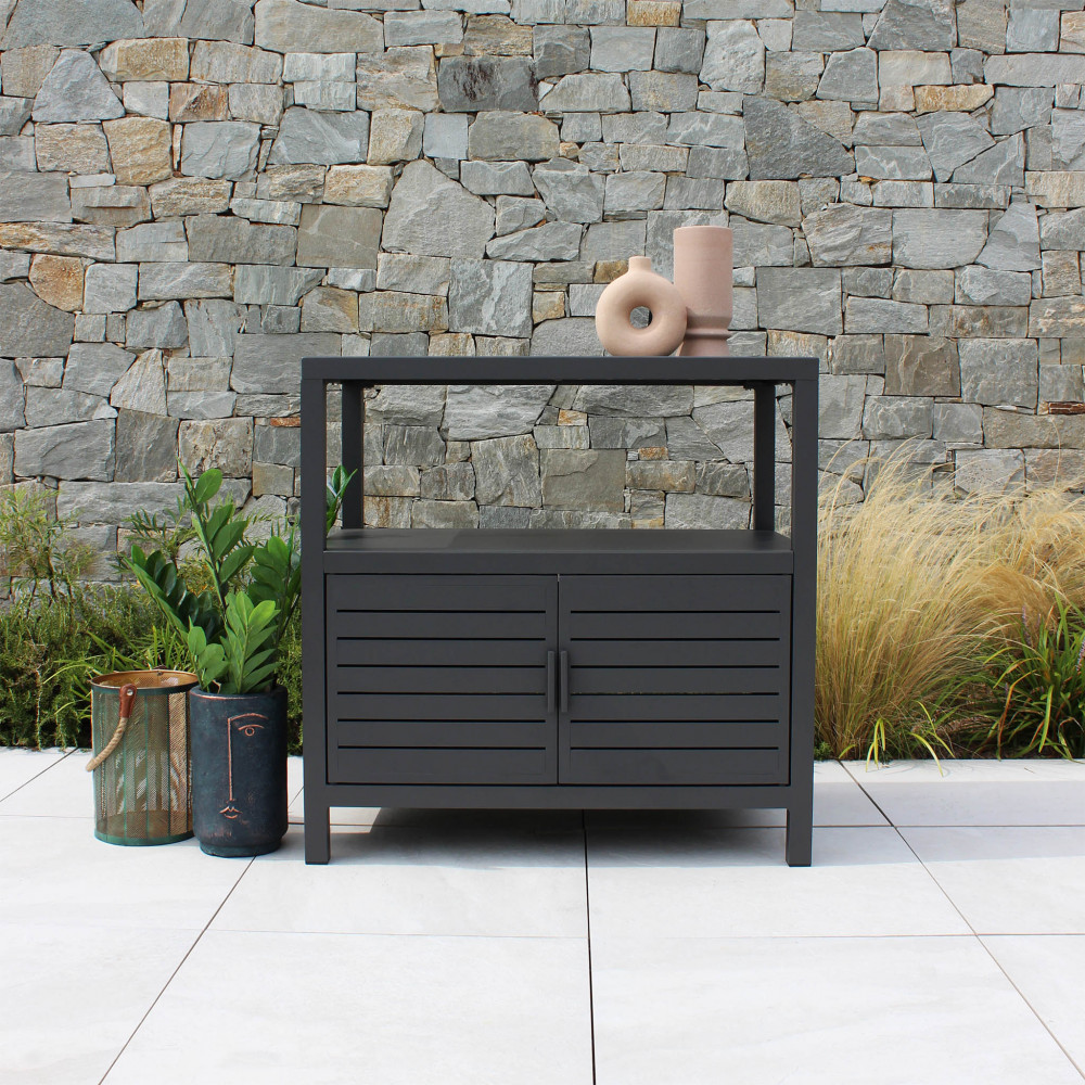 Mobiletto da giardino o da esterno Queens è un complemento di arredo giardino in alluminio verniciato a polvere colore bianco o antracite. Questo mobile da giardino è perfetto e soprattutto indicato come piccolo ripostiglio, o piano di appoggio per gli spazi esterni.