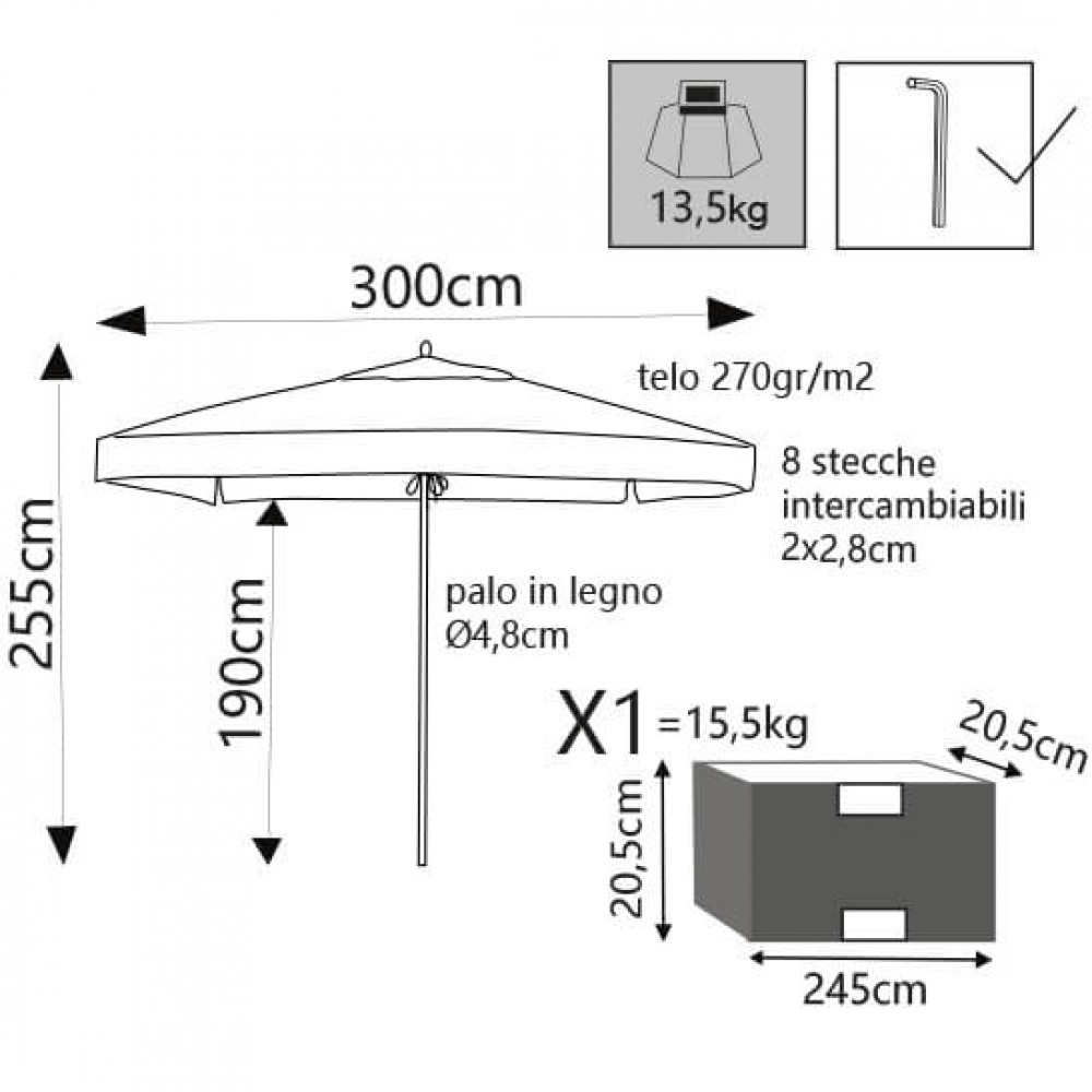 Telo in poliestere BEIGE 270 gr palo in legno Ø 48 mm x 240 cm 8 stecche 20 x 28 mm intercambiabili Dimensioni: m Ø 3