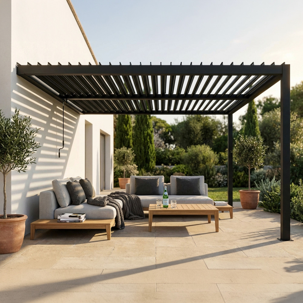 struttura in alluminio bianco o grigio scuro copertura a lamelle frangisole orientabili a movimentazione manuale Dimensioni: cm 396 l x 256 p x 245 h