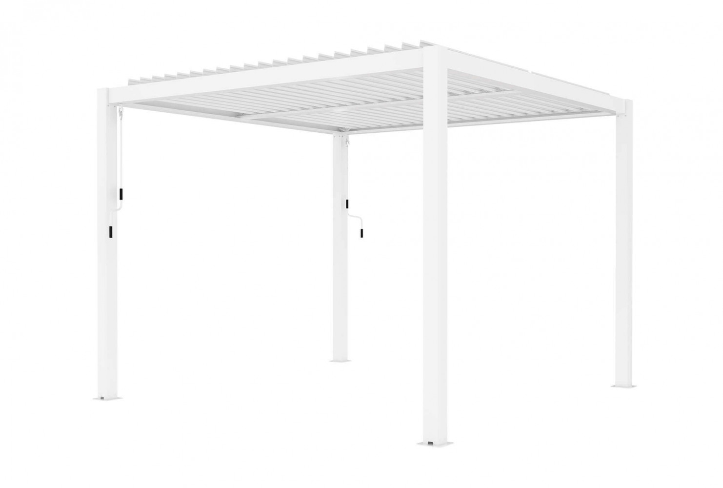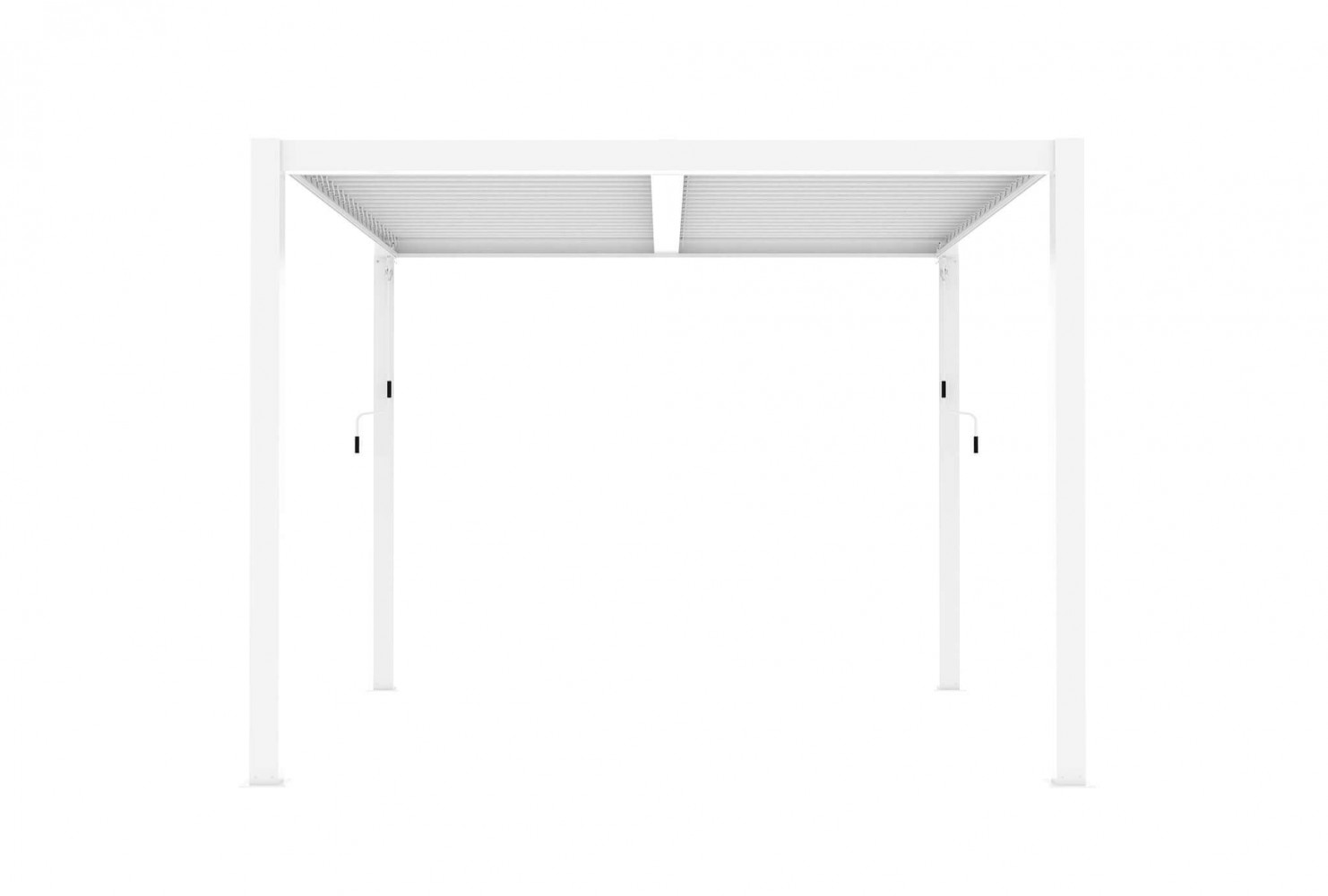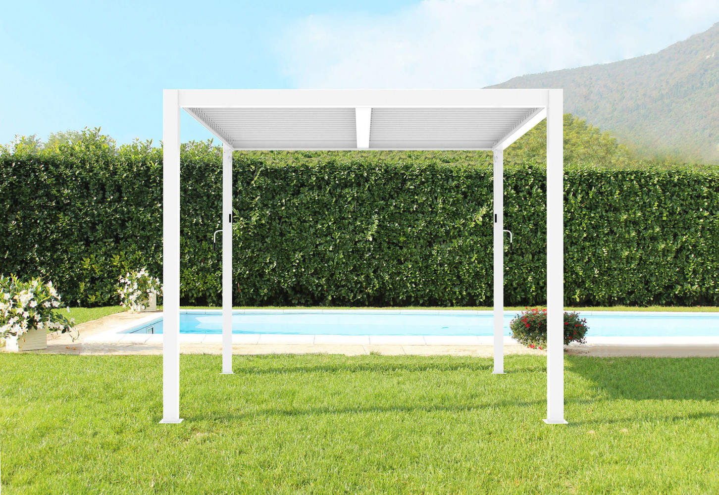 Struttura in alluminio bianco o grigio scuro copertura a lamelle frangisole orientabili a movimentazione manuale resistente a tutte le intemperie Dimensioni: m 4 x 4 x 2,5 h