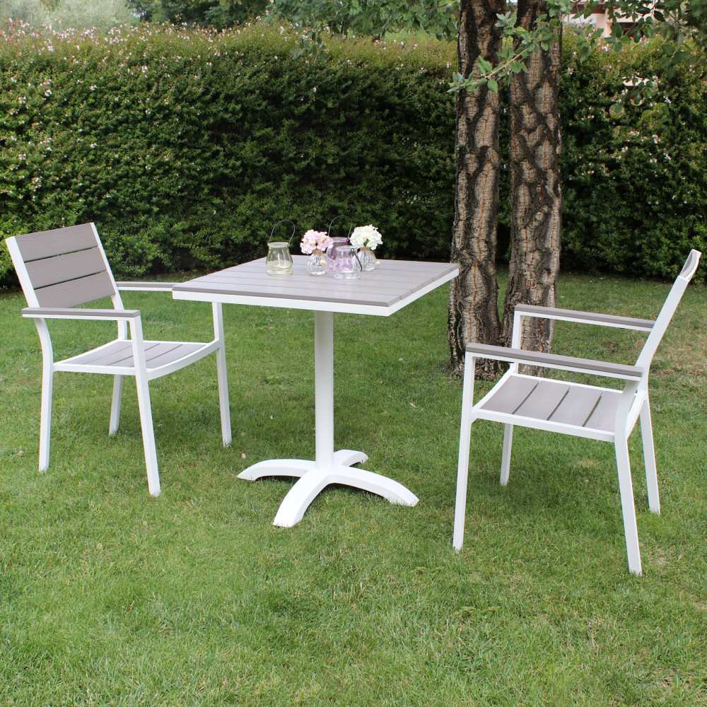 Struttura in alluminio verniciato BIANCO, TORTORA o TAUPE o ANTRACITE schienale e seduta con doghe in POLYWOOD colore grigio Dimensioni: cm 58 x 58 x 89 h