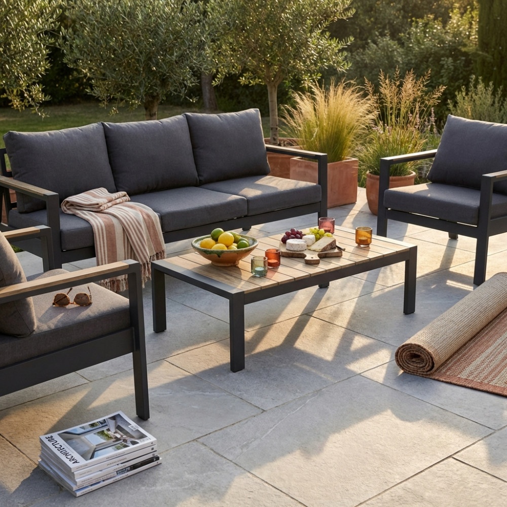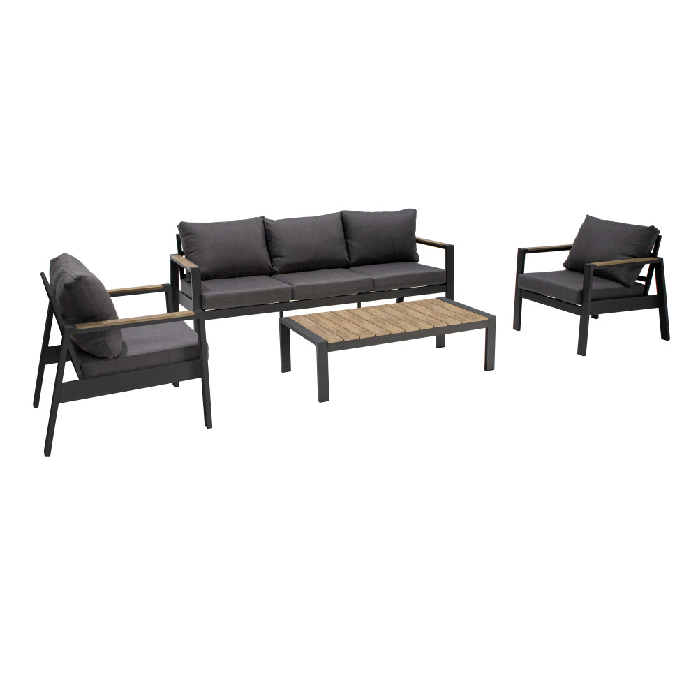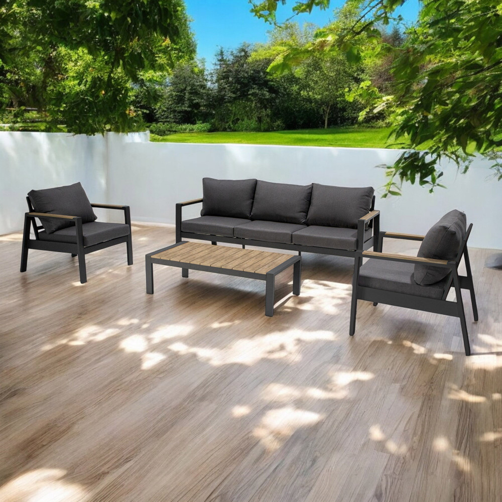 struttura in alluminio verniciato antracite o bianco cuscini 12 cm Dimensioni: Divano: cm 201x84x83 Poltrona: cm 75x84x83 Tavolino: cm 120x60x35