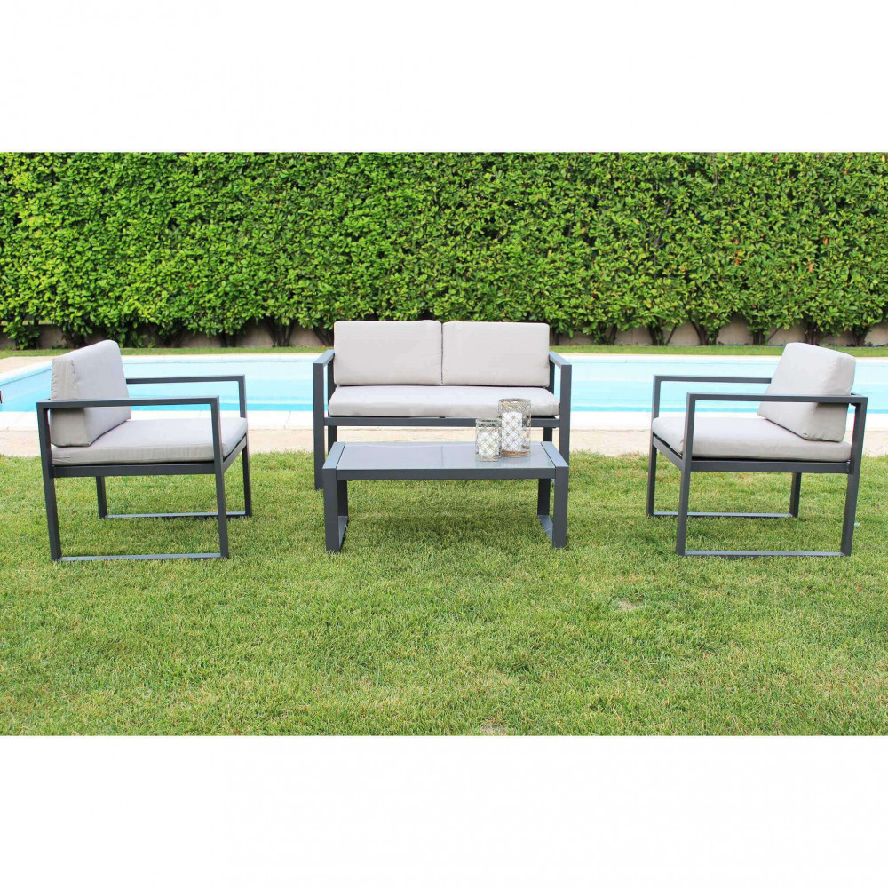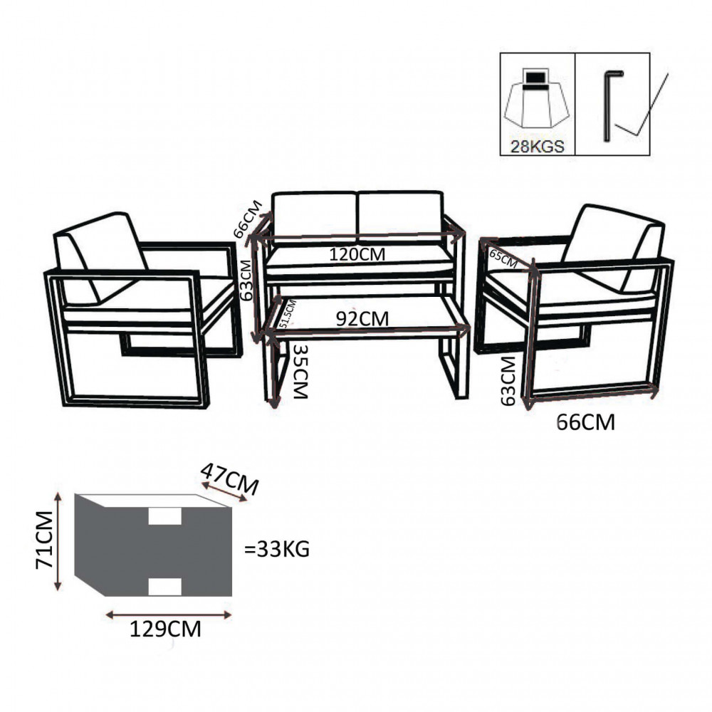 Struttura in alluminio verniciato BIANCO, TORTORA, TAUPE o ANTRACITE, cuscini in poliestere vetro tavolino 5 mm Dimensioni: D.120x66x63/P.65x66x63/T.92×51,5×35