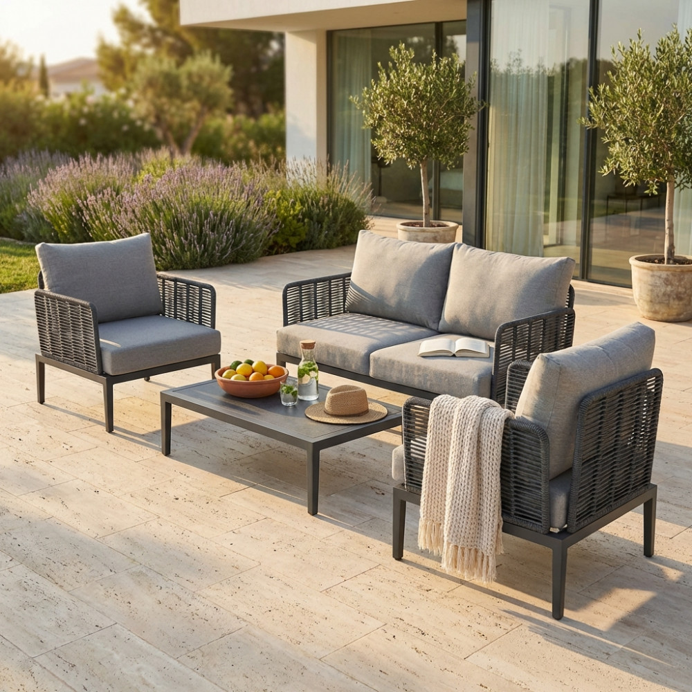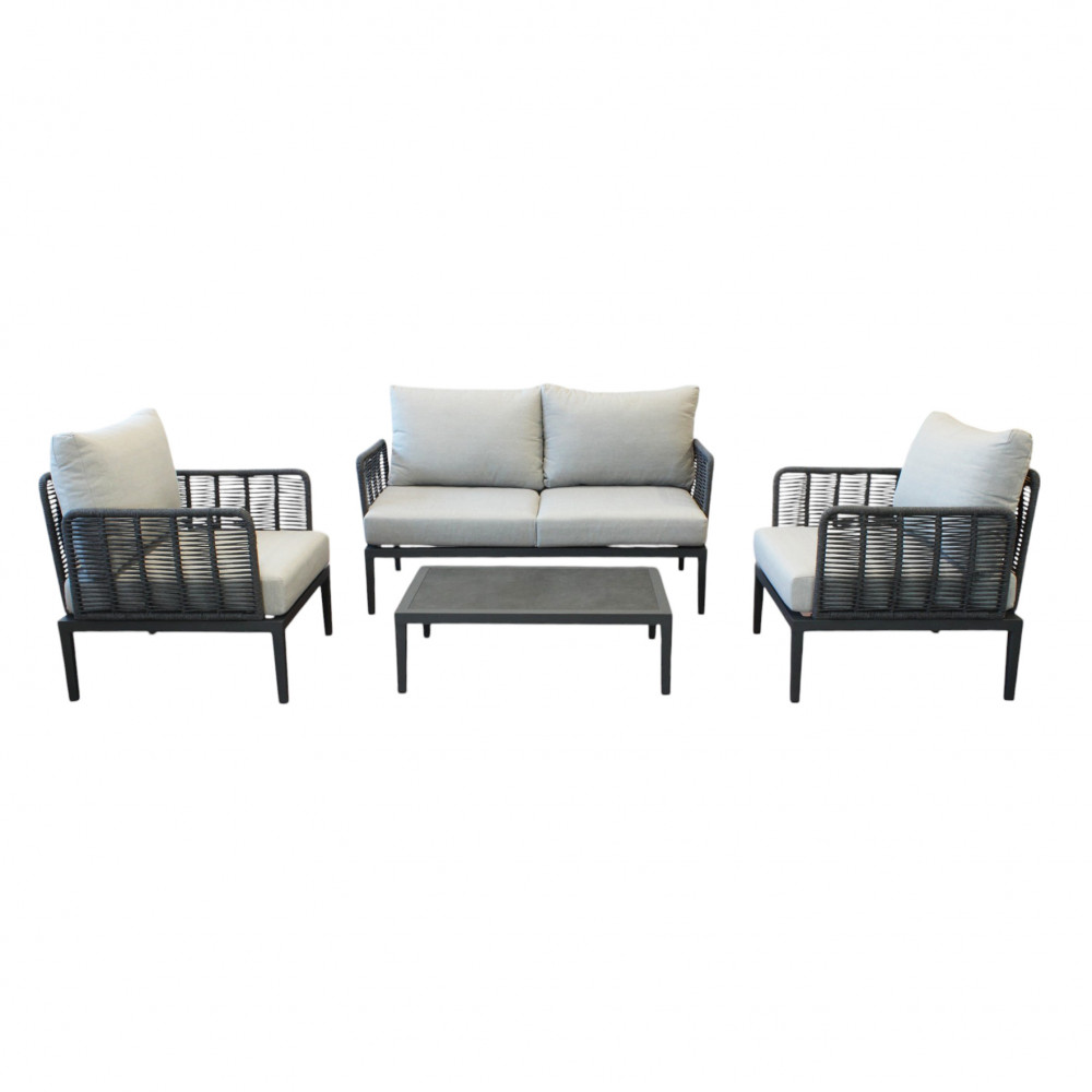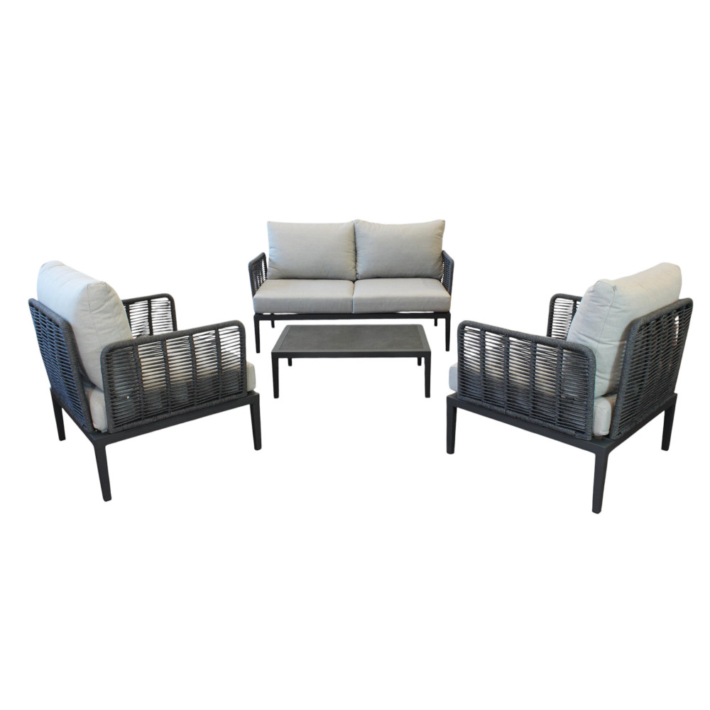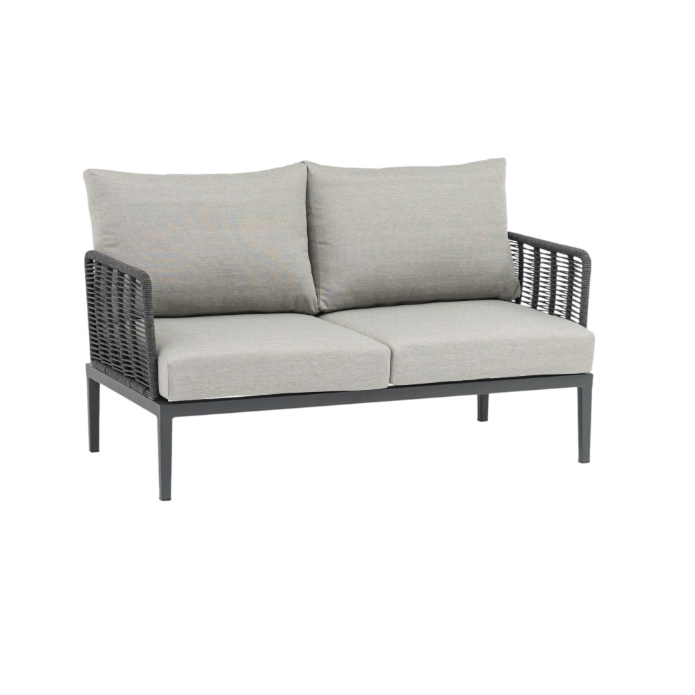 struttura in alluminio verniciato antracite rivestimento in corda in pvc con cuscini Dimensioni: Poltrona: cm 81x80x75