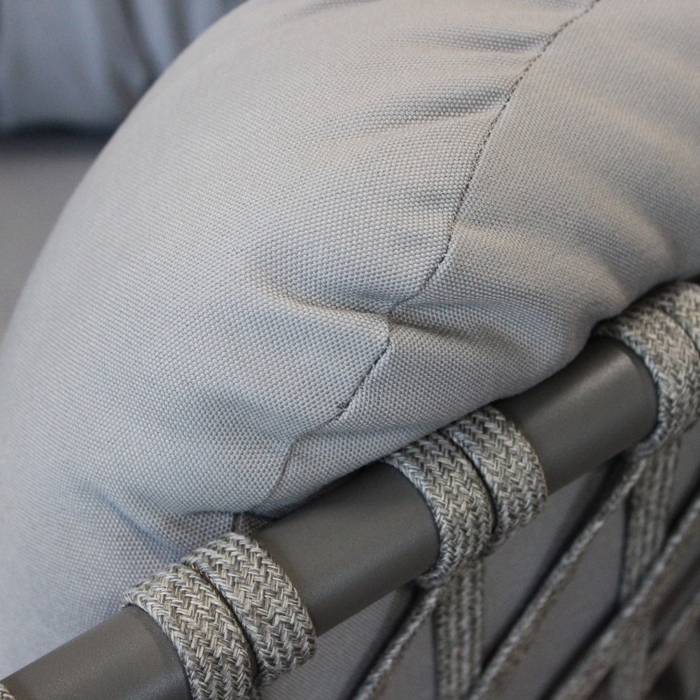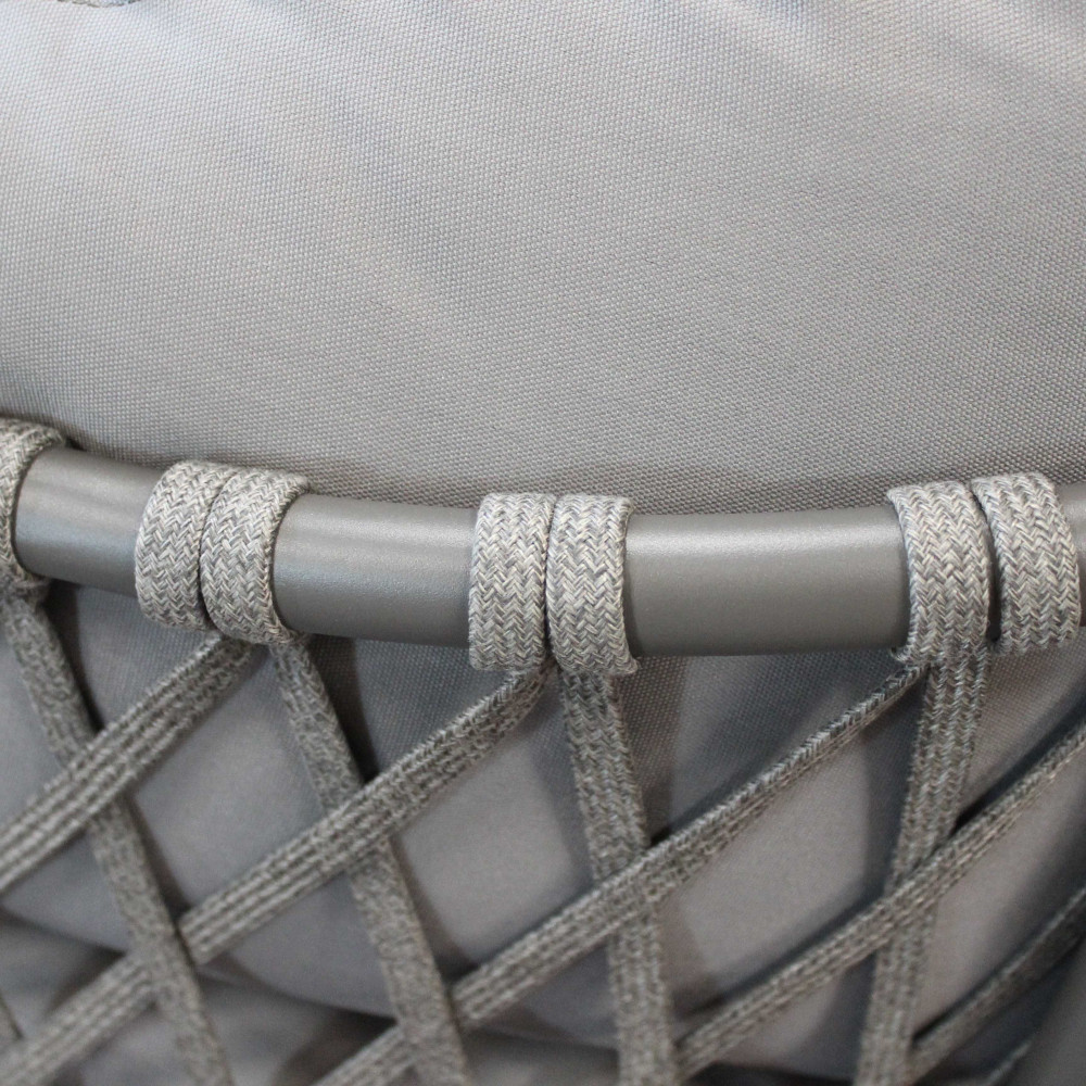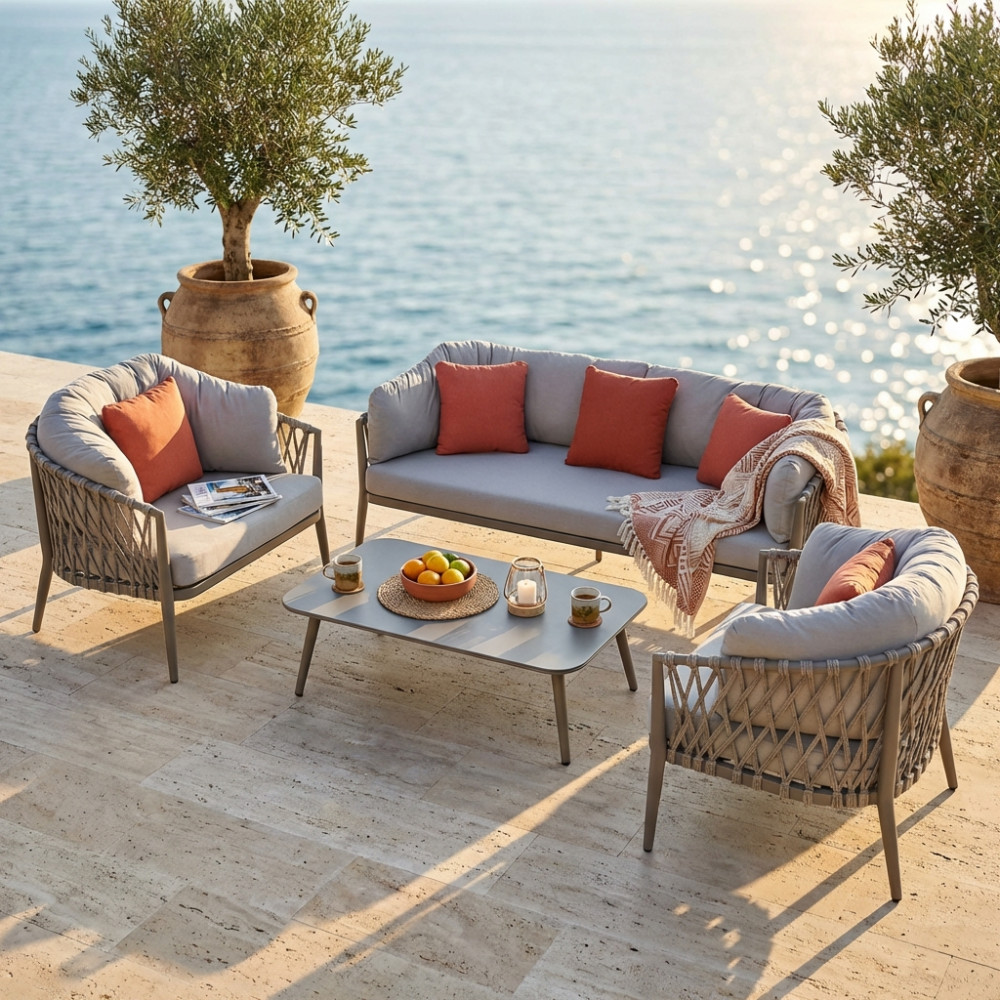 struttura in alluminio verniciato taupe o bianca rivestimento in corda in pvc Dimensioni: Divano: cm 210x86x75 Poltrona: cm 85x86x75 Tavolino: cm 100x60x30