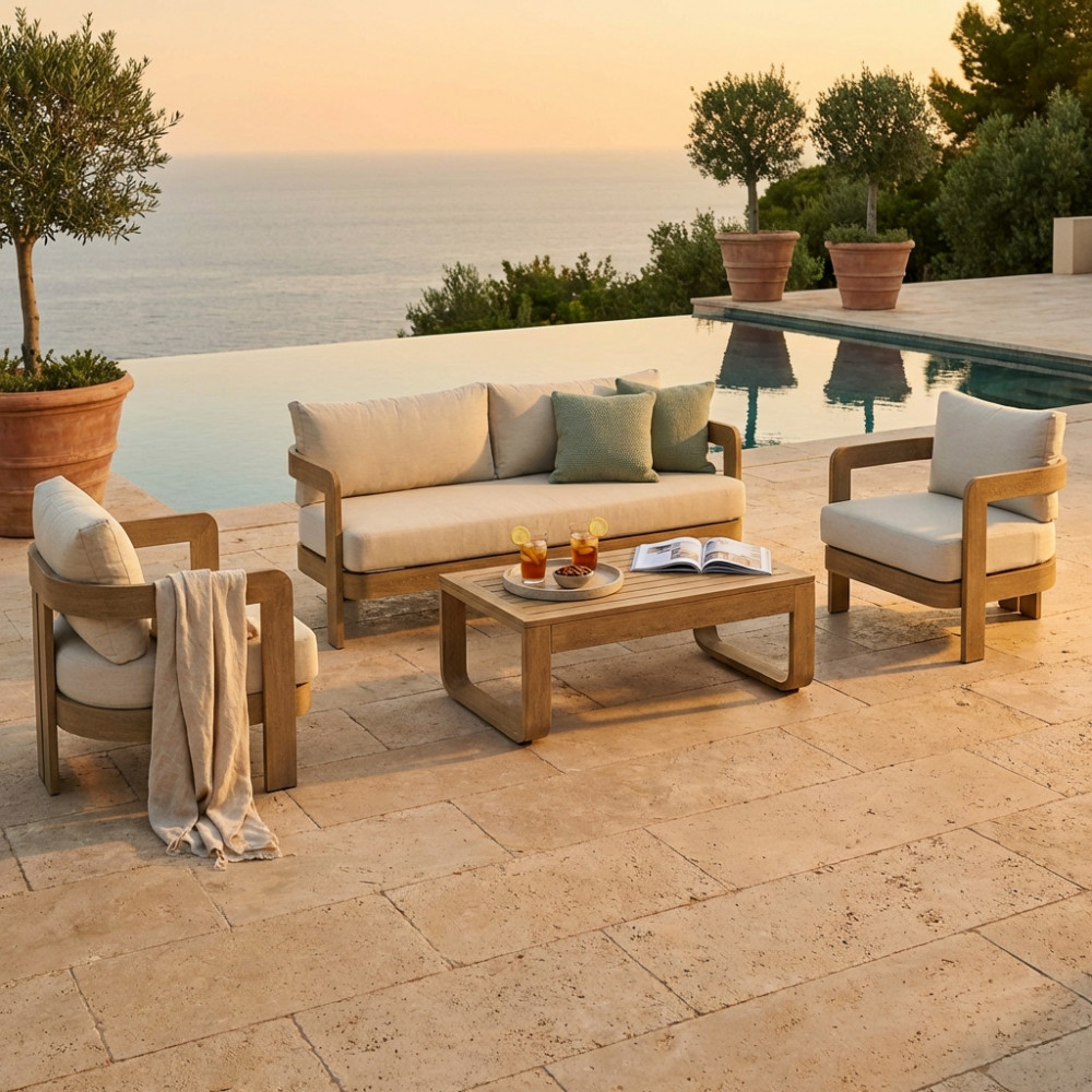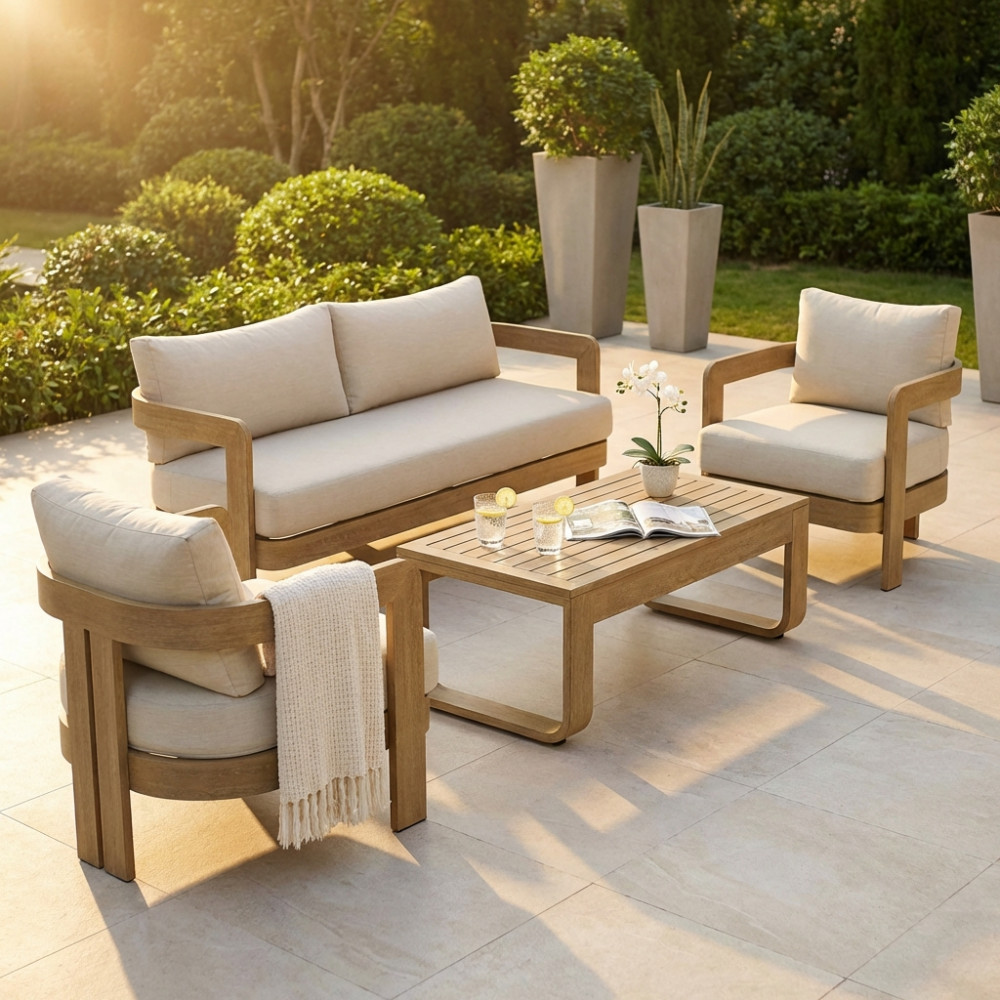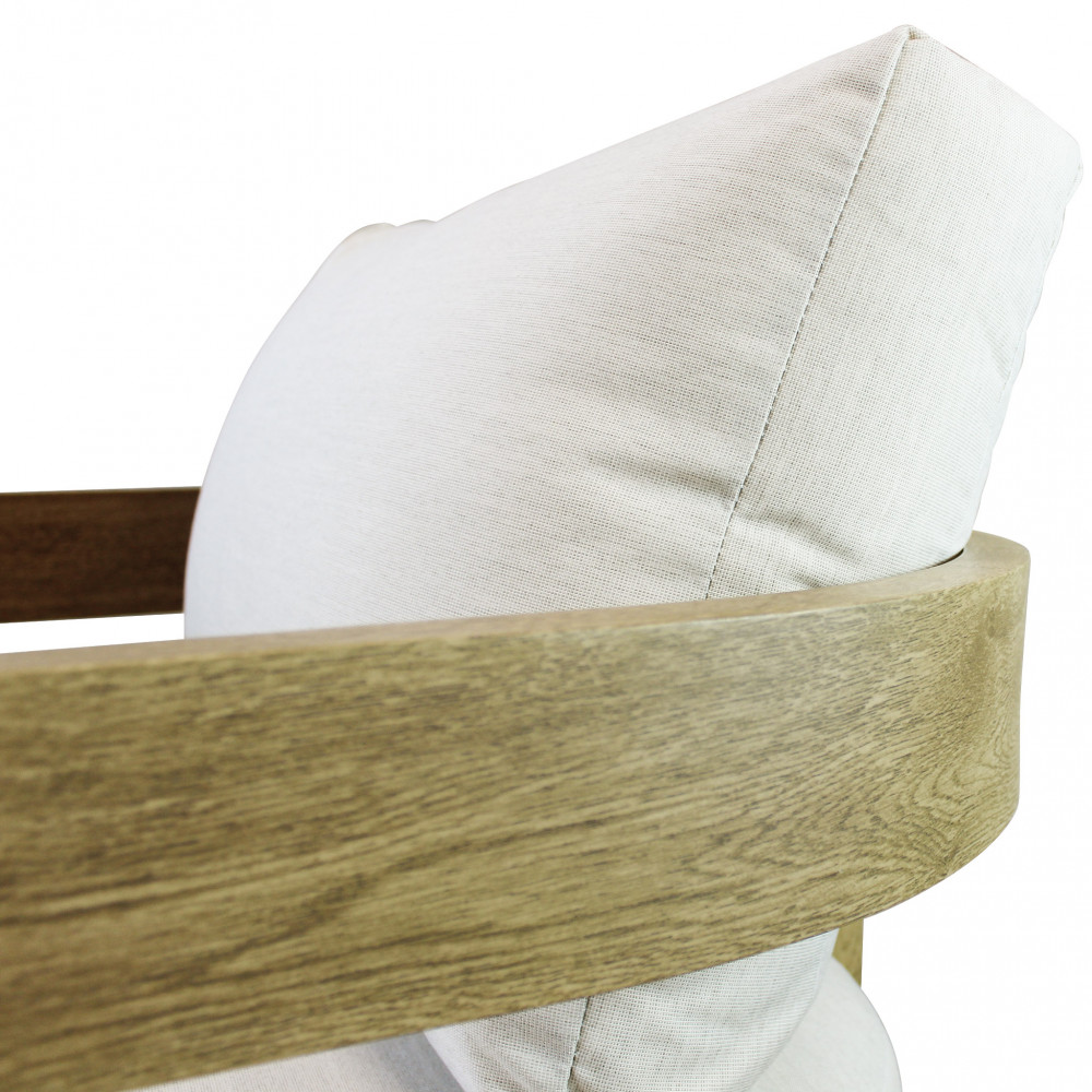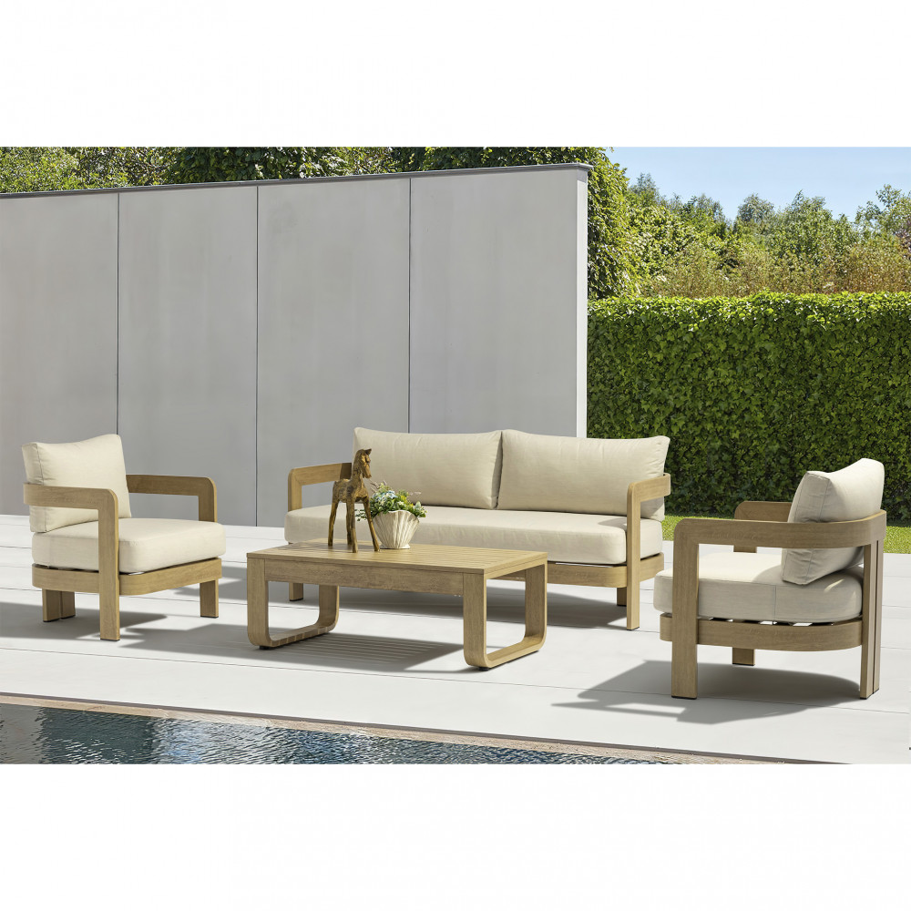 struttura in alluminio verniciato effetto legno cuscini beige 15 cm Dimensioni: Divano: cm 185×72,5×66