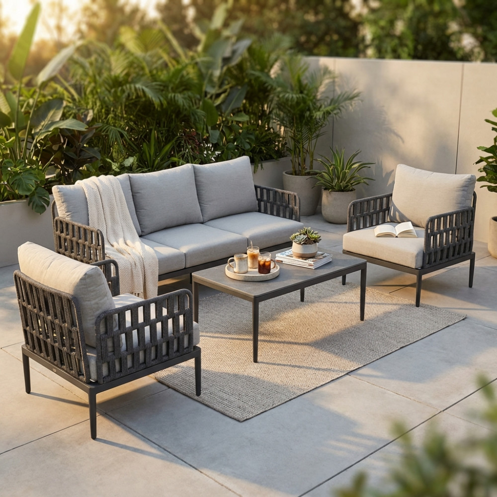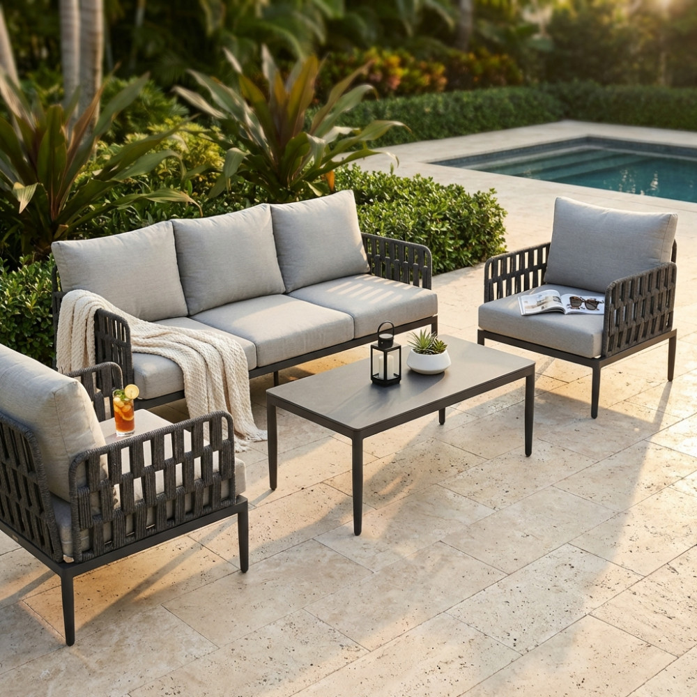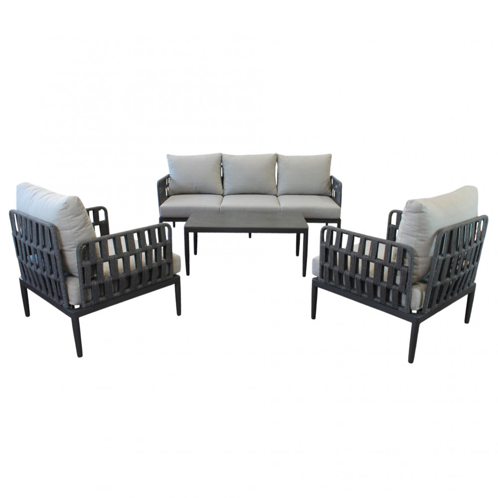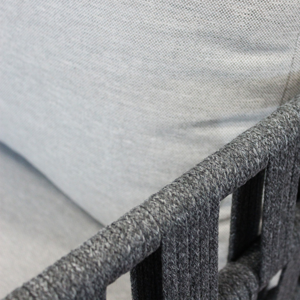 struttura in alluminio grigio chiaro, naturale o antracite rivestimento in corda in pvc con cuscini Dimensioni: Poltrona: cm 81x80x75