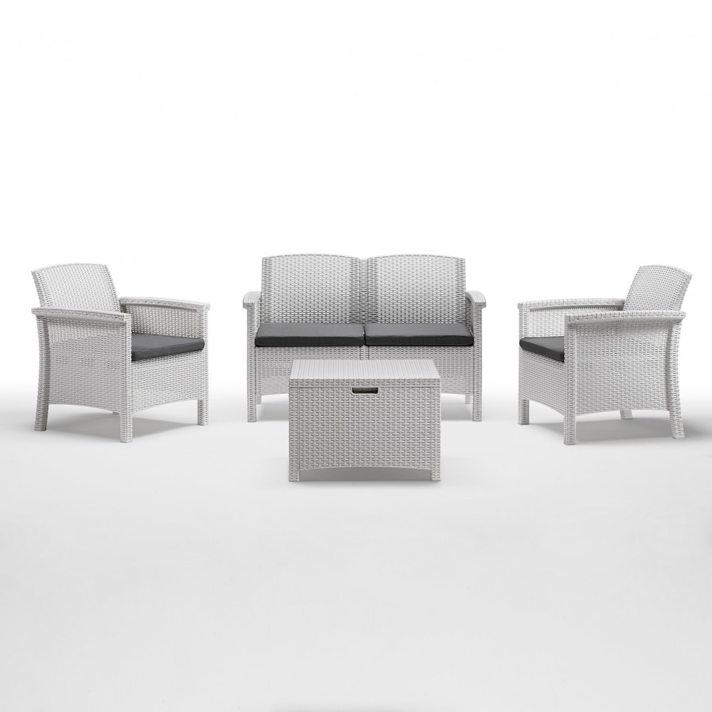 Struttura in plastica stampata, wicker BIANCO, NERO, o TAUPE con cuscini Dimensioni: D.117×64,5×76/P.63×64,5×76/T60x54,5×40,5