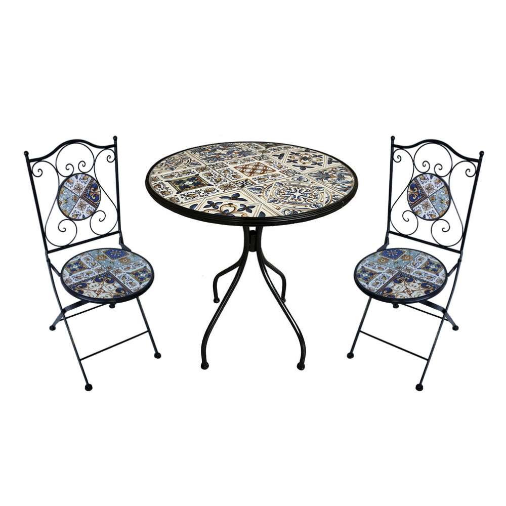 piano rotondo, schienale e seduta con decoro base in ferro verniciato a polvere antracite Dimensioni: cm 60 Ø x 75 h