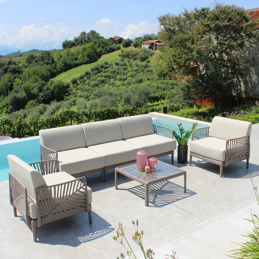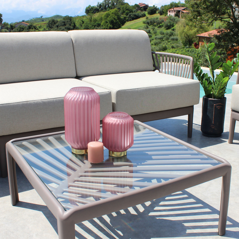 struttura in polipropilene bianco, taupe, torotora o verde con vetro Dimensioni: cm 70 l x 70 p x 32 h