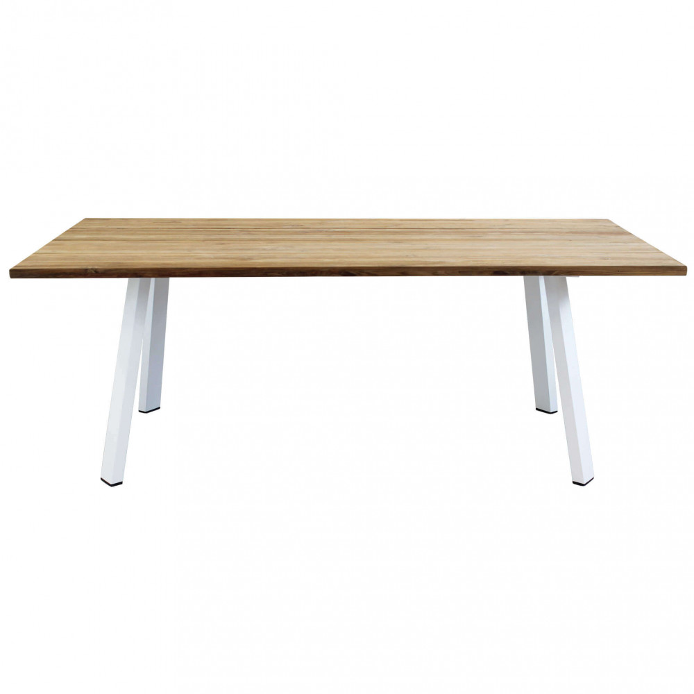 Tavolo da giardino in legno Hampton è moderno tavolo da esterno fisso con struttura in alluminio verniciato a polvere bianco e piano in legno, teak riciclato, spessore 3cm.