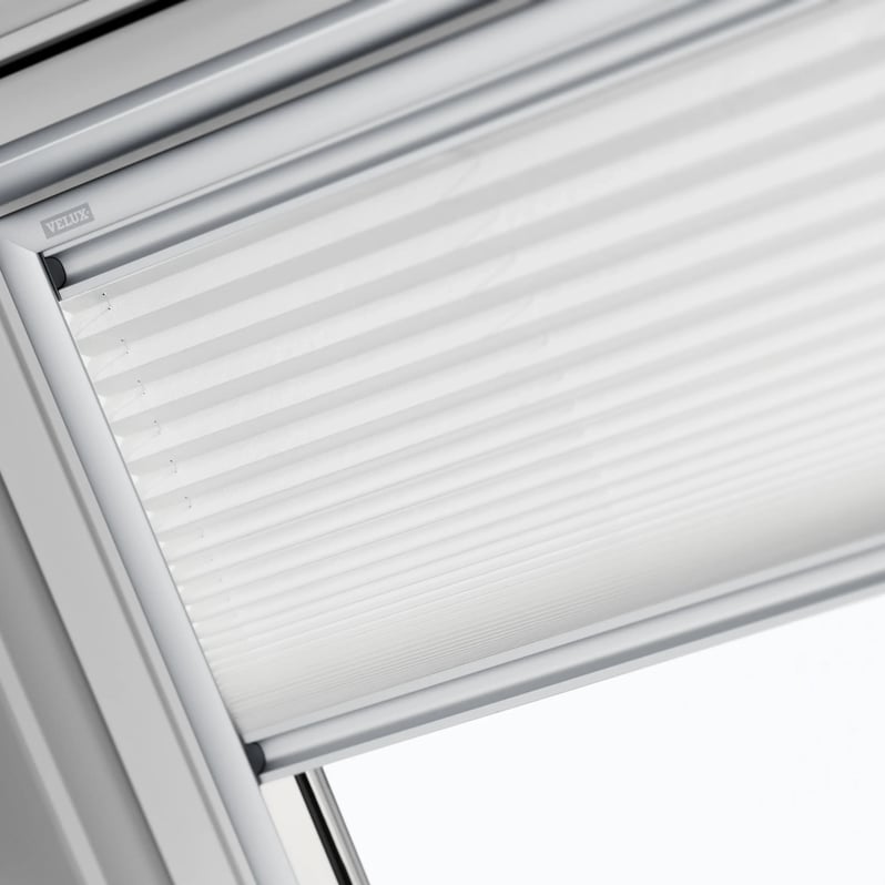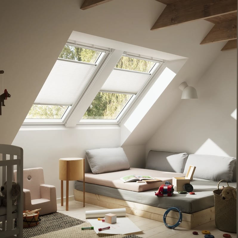Le tende filtranti plissettate Velux permettono di controllare la luce, creando originali giochi luminosi e una piacevole atmosfera nell’ambiente.